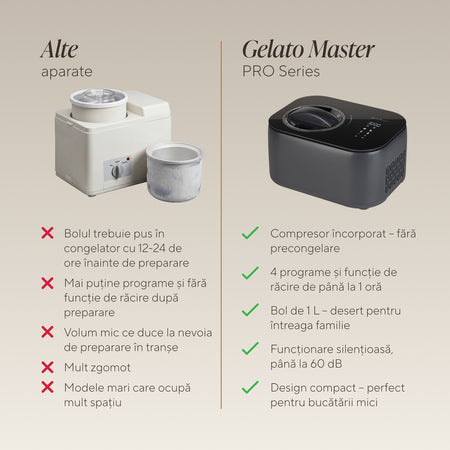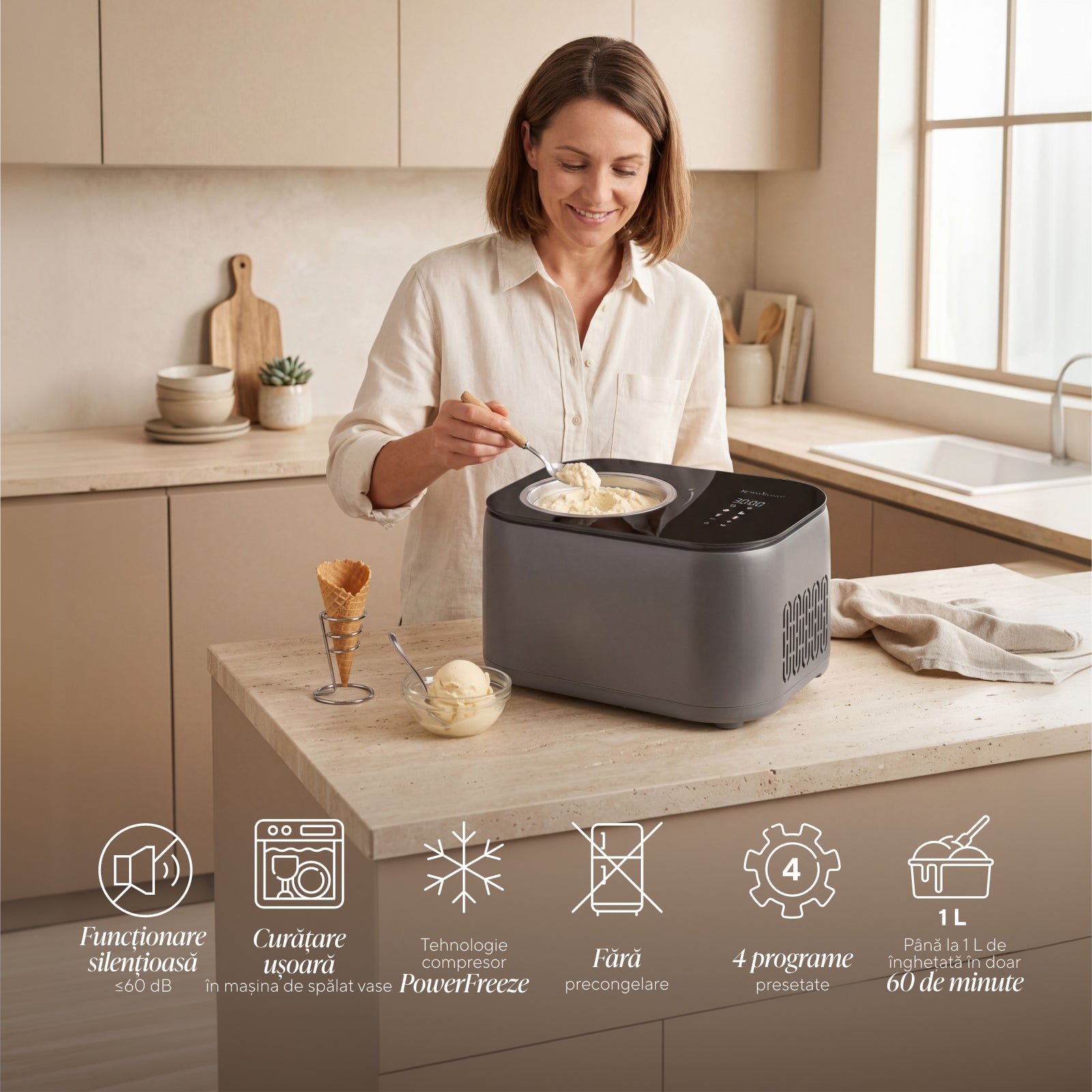 - Preparare rapidă – dintr-o bază proaspătă, creezi înghețată bogată și cremoasă în doar 35–60 de minute