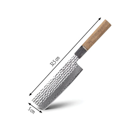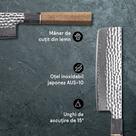 Lama cuțitului de bucătărie este fabricată din oțel inoxidabil AUS-10 de la forja japoneză AICHI, cunoscută pentru calitate. Aspectul premium al cuțitului este completat de modelul distinctiv Damascus și mânerul din lemn, reflectând designul japonez.