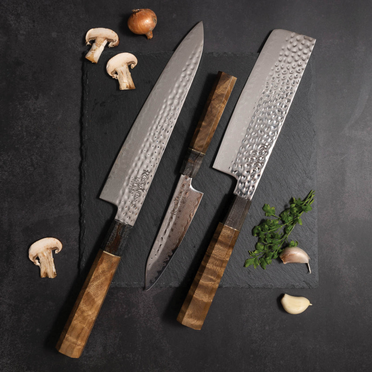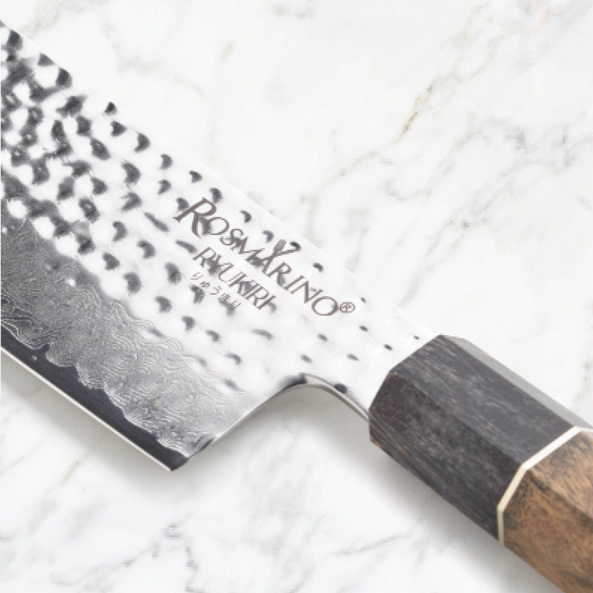• Aspectul premium al cuțitului este completat de modelul unic Damascus și mânerul din lemn, reflectând designul japonez.
