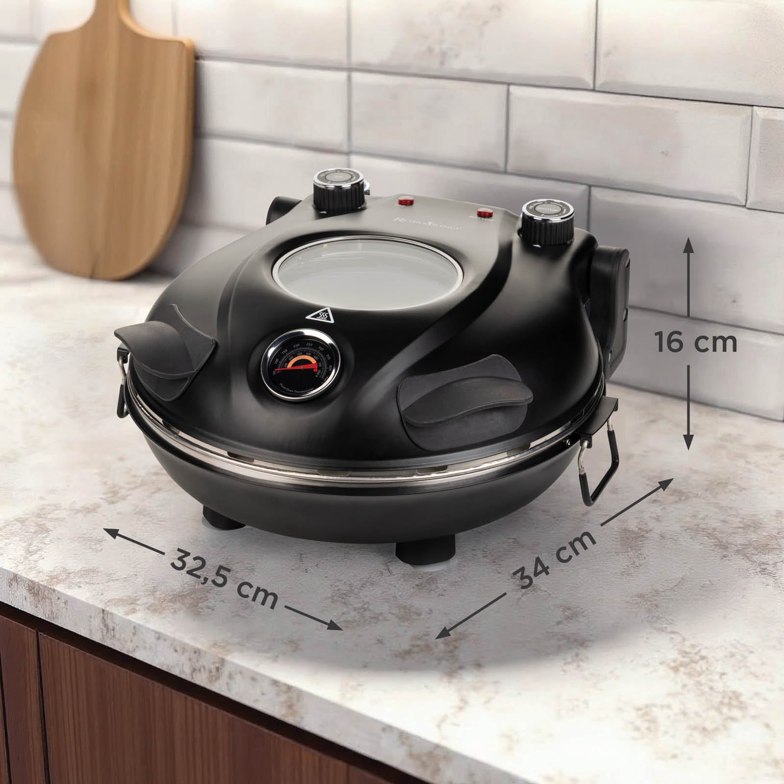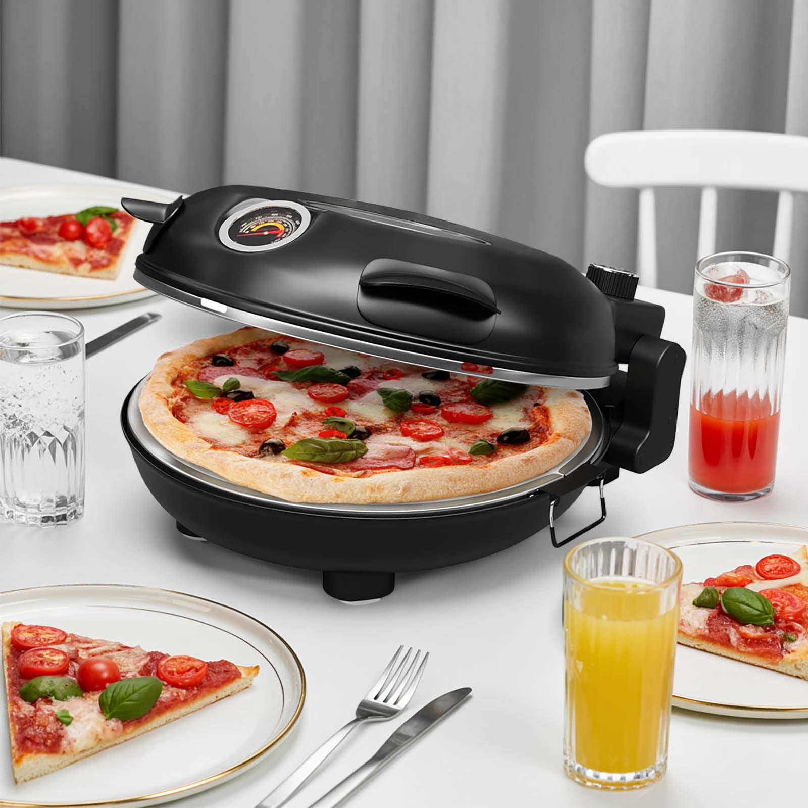 Gata cu ghicitul sau verificarea constantă a preparatelor. Termometrul încorporat îți permite să monitorizezi cu precizie temperatura, iar fereastra de sticlă îți permite să verifici progresul. Gata cu crustele arse sau toppingurile pe jumătate gătite. Vei obține întotdeauna rezultate perfecte.