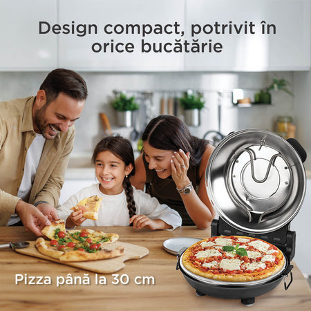 Cu acest dispozitiv pizza va fi gata în doar câteva minute! Puterea de 1200 W asigură o încălzire rapidă, iar piatra cu diametrul de 30 cm este ideală pentru o masă în familie sau o întâlnire cu prietenii. Mai rapid decât livrarea la domiciliu și mult mai gustos!