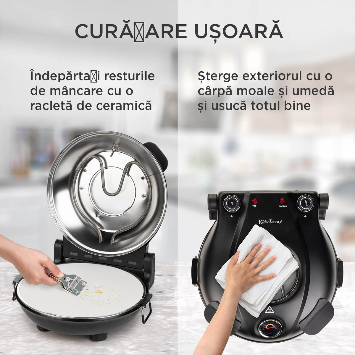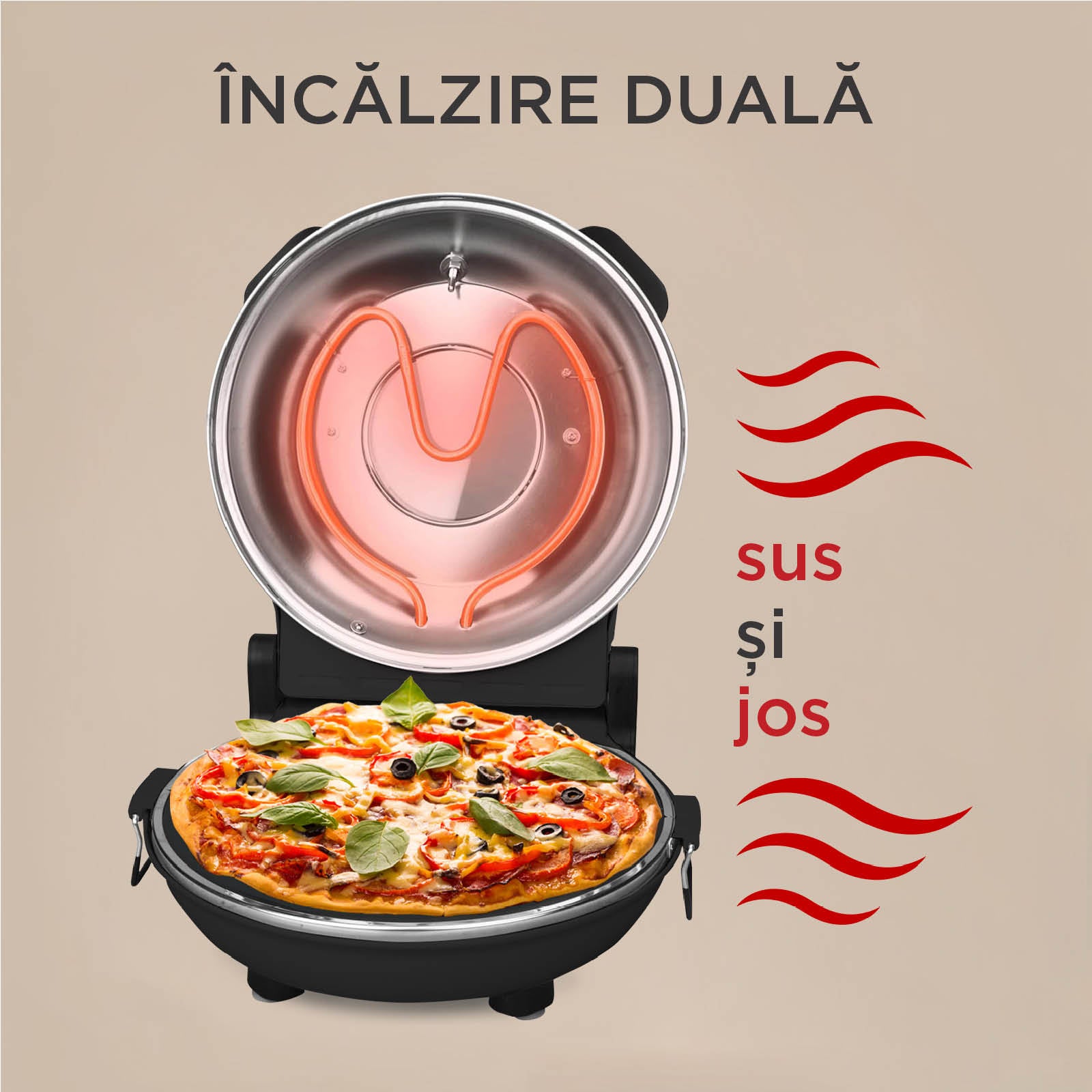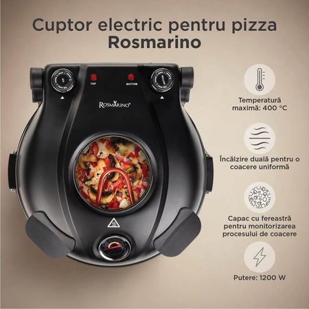 - Rezistența dublă (sus și jos) garantează o pizza coaptă uniform, cu o crustă crocantă și toppinguri suculente.