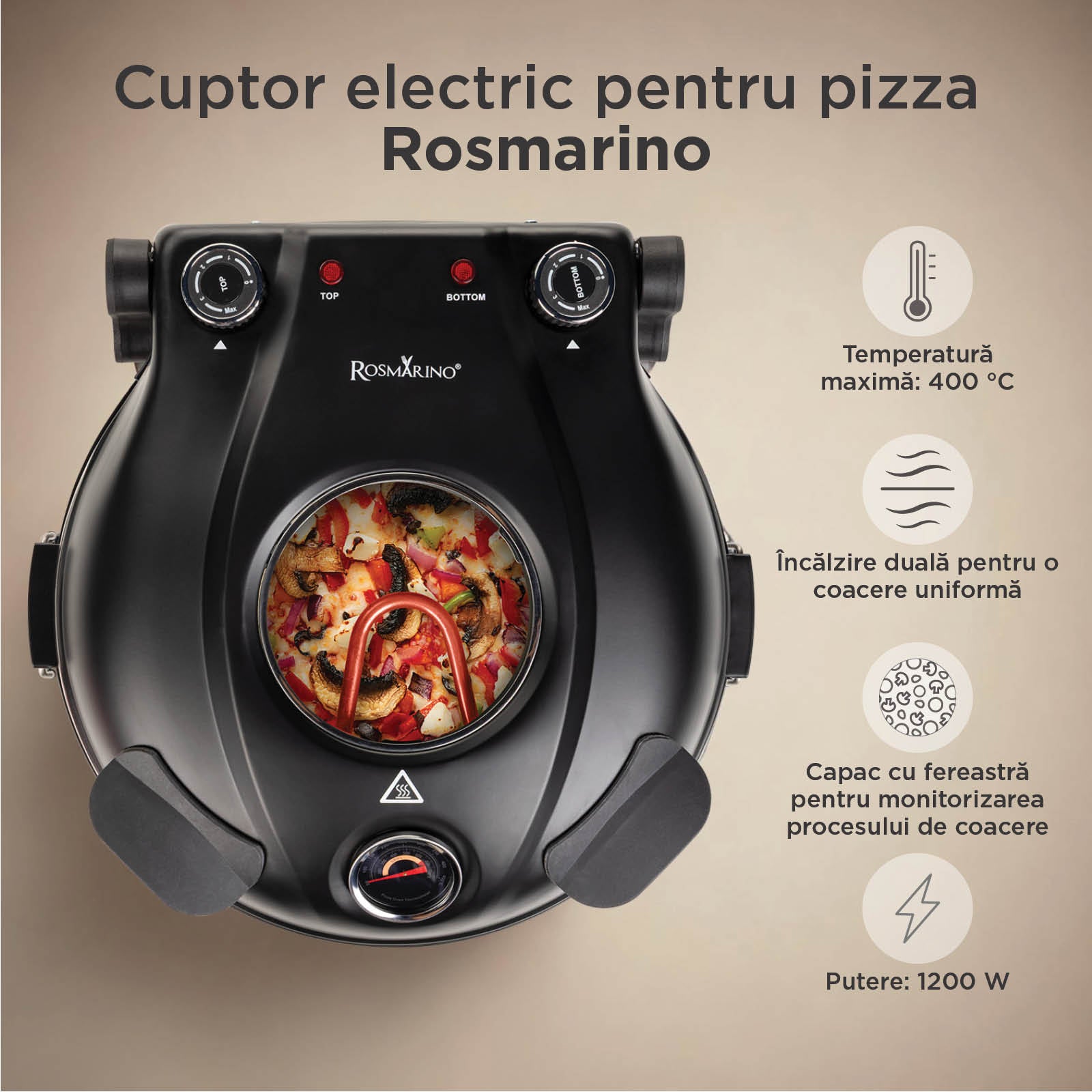 - Fereastra de pe capac permite monitorizarea procesului pentru a coace pizza după preferințe.