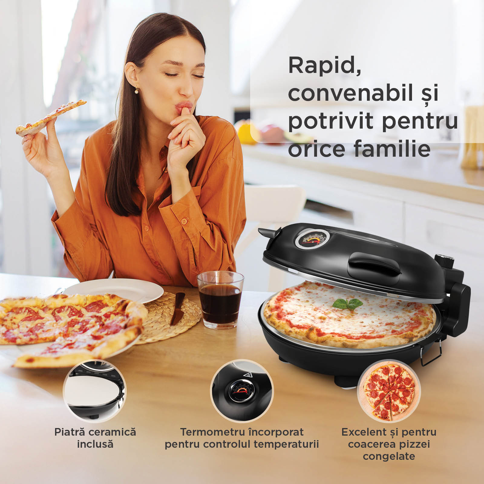 - Temperatură maximă de 400 °C pentru coacere rapidă, crustă crocantă și toppinguri suculente.