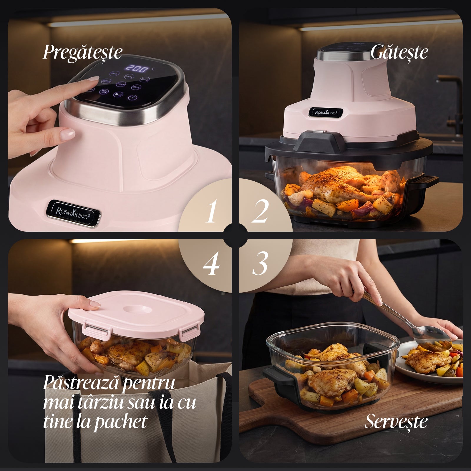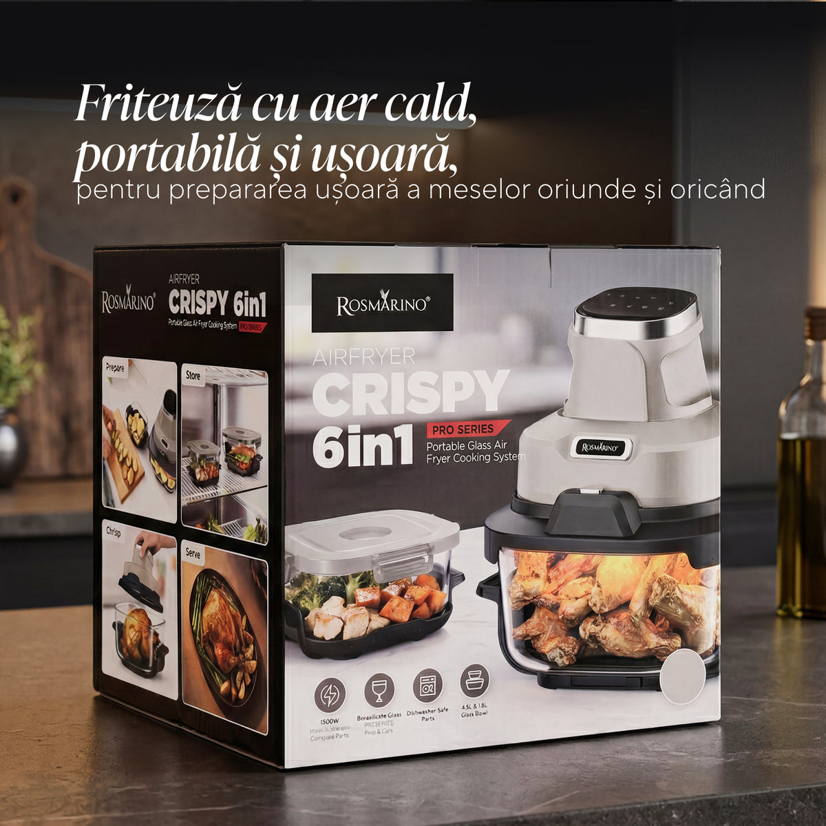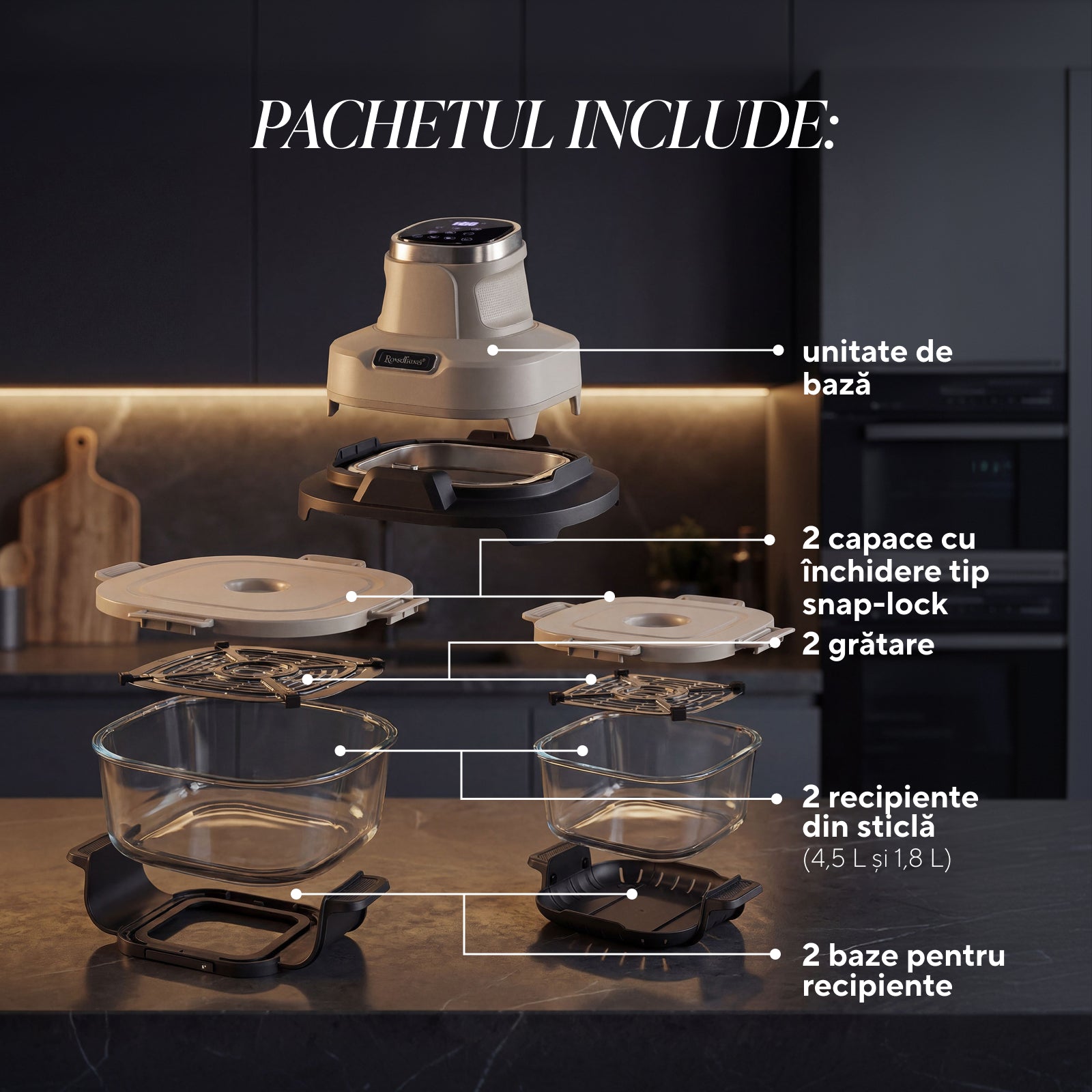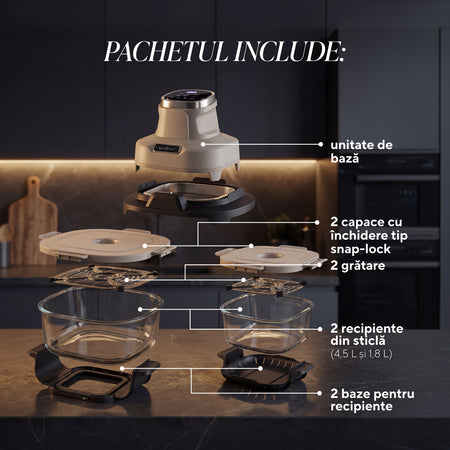 - Setul include: unitate de bază, 2 recipiente din sticlă Crispy2Go (4,5 L și 1,8 L), 2 grătare, 2 capace cu închidere, 2 suporturi pentru recipiente