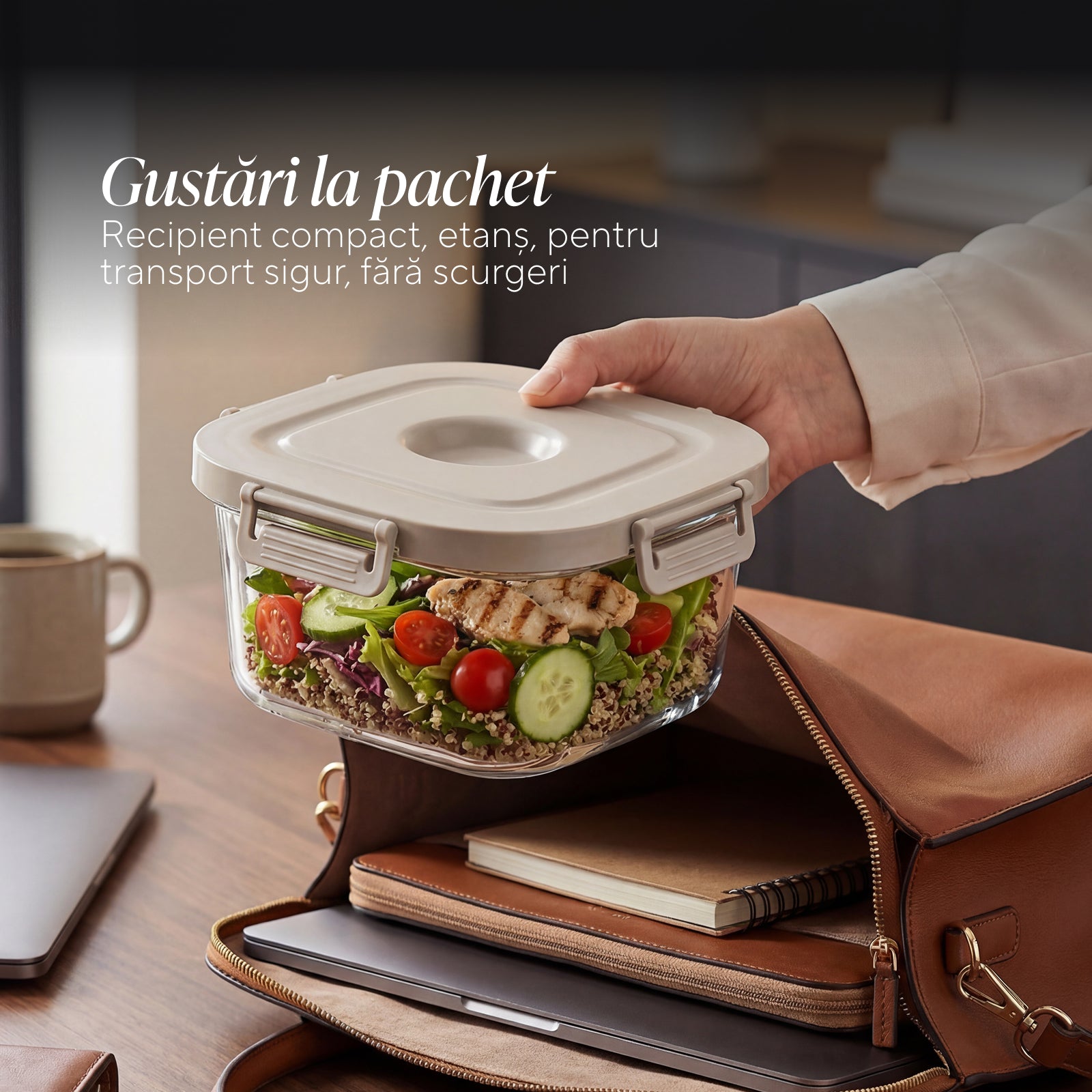 - Capacul practic cu închidere etanșă păstrează preparatele în siguranță în recipient