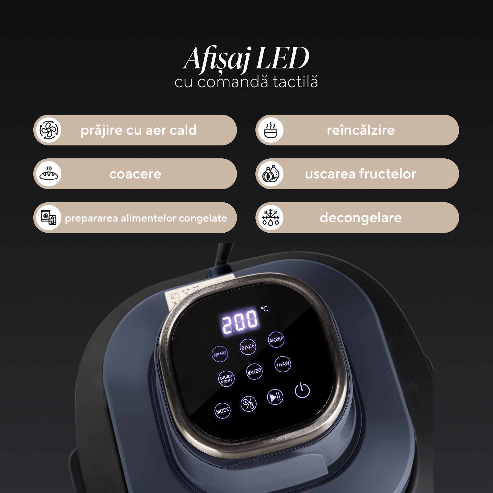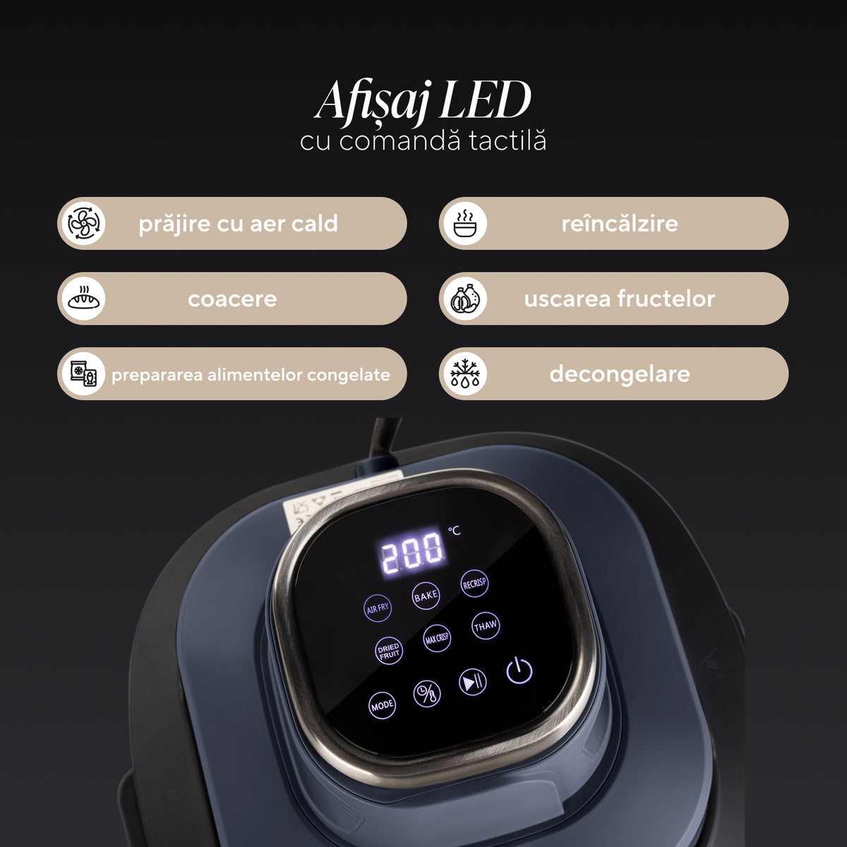 - 6 funcții presetate: prăjire cu aer cald, coacere, prepararea alimentelor congelate pre-gătite, reîncălzire, uscarea fructelor, decongelare