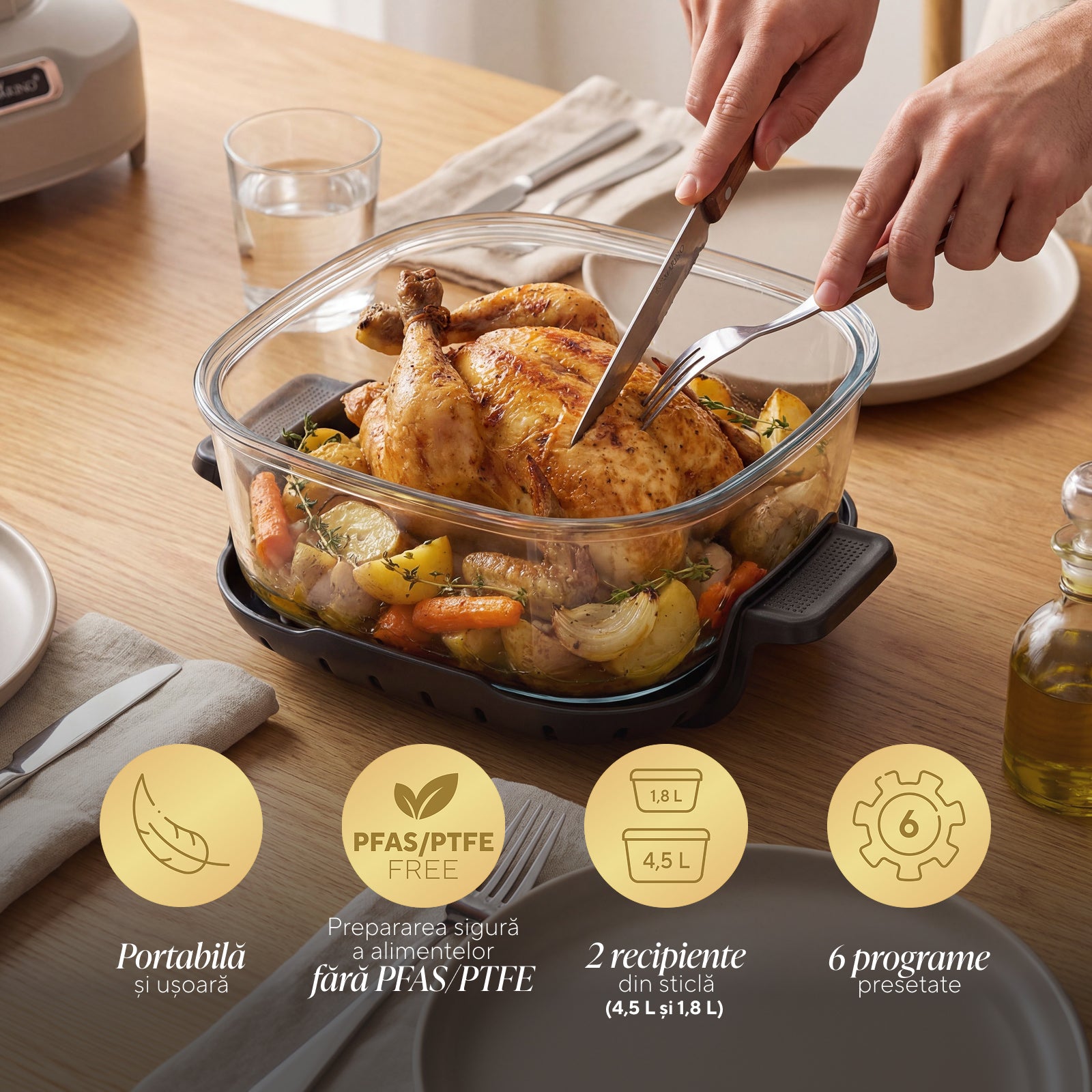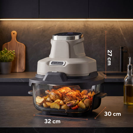 - 2 recipiente din sticlă Crispy2Go (4,5 L și 1,8 L) pentru mese mici sau mari