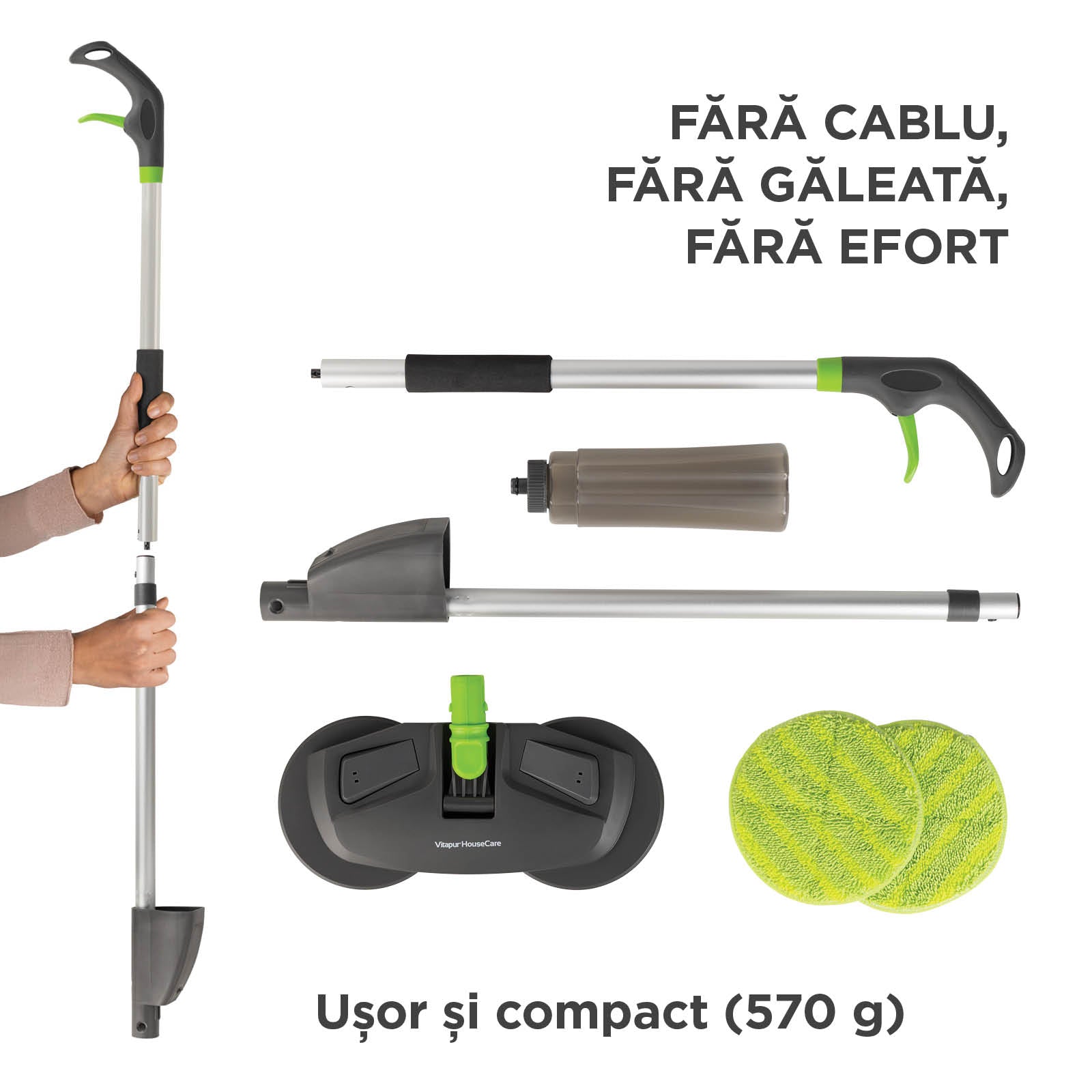 • Fără cabluri, fără găleată, fără efort – apasă, pulverizează și șterge.