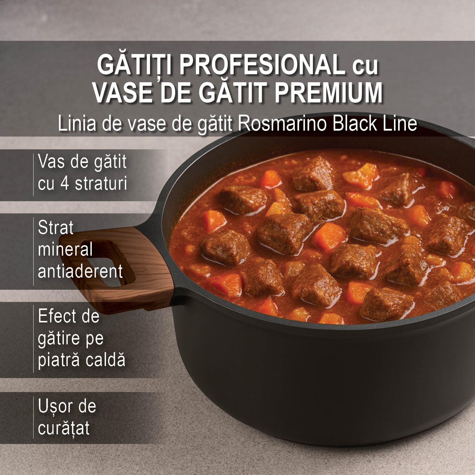 Materiale de calitate alese pentru o gătire rapidă, oferind o durată lungă de viață vaselor de gătit.