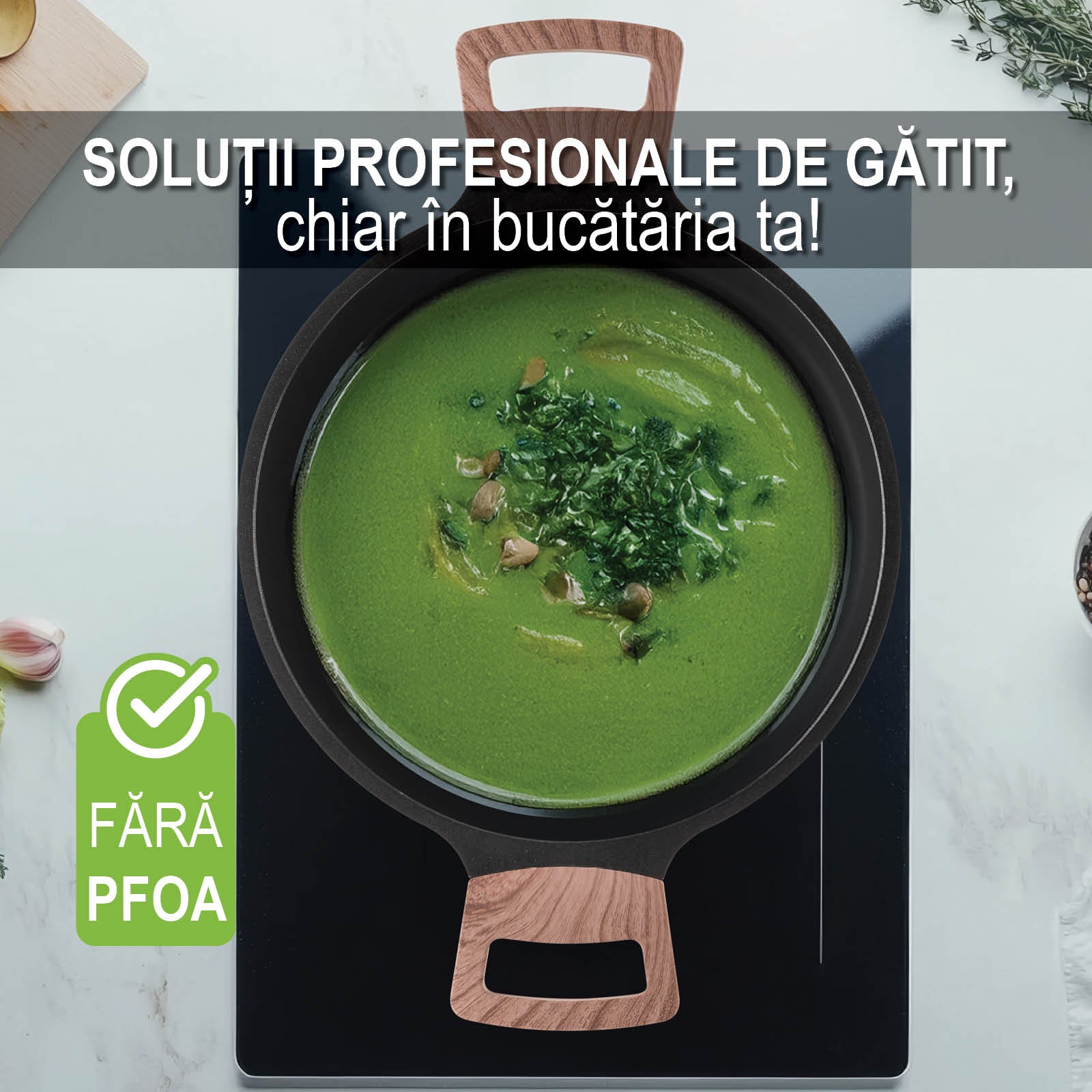 - Toate vasele noastre de gătit sunt proiectate conform celor mai înalte standarde și nu conțin substanțe nocive precum PFOA sau alte chimicale periculoase.
