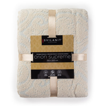 Alege pătura decorativă Orion Supreme pentru a da un aer luxos oricărei încăperi. Fabricat din cele mai bune materiale, acest model emană rafinament și eleganță. Cu designul său unic și textura extrem de moale, această pătură transformă orice dormitor sau cameră de zi într-o oază de confort și stil. În nopțile calde de vară, materialul său ușor și respirabil te răcorește și îți asigură un somn de calitate, în timp ce iarna îți oferă căldură în timpul somnului sau când stai la TV pe canapea. Desigur, poți folosi pătura Orion Supreme și pentru a proteja în mod elegant mobilierul, în excursii sau în drumeții.