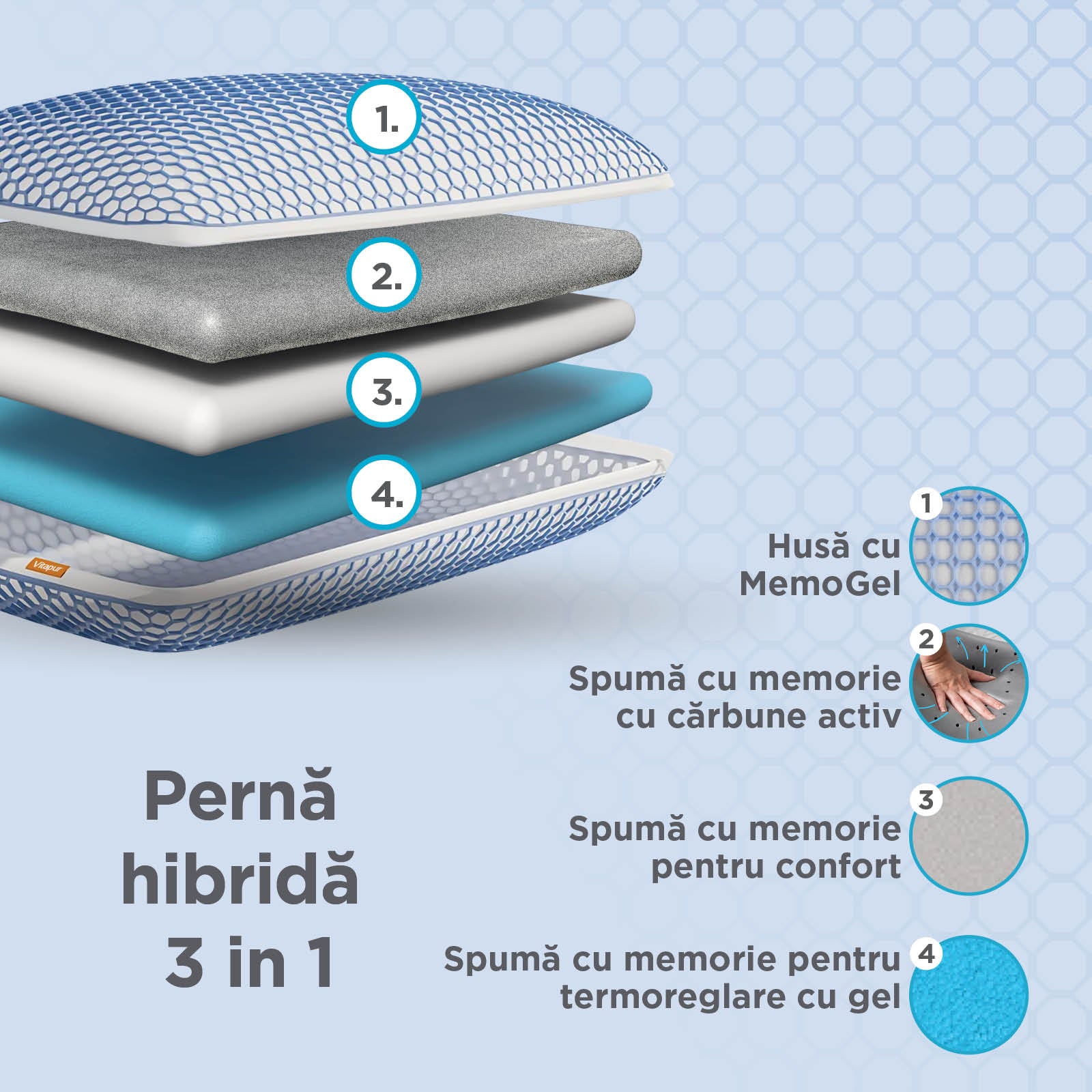 - Perna hibridă 3-în-1 din spumă cu memorie: 3 tipuri de spumă funcțională pentru suport optim, reglarea temperaturii și senzație de prospețime.