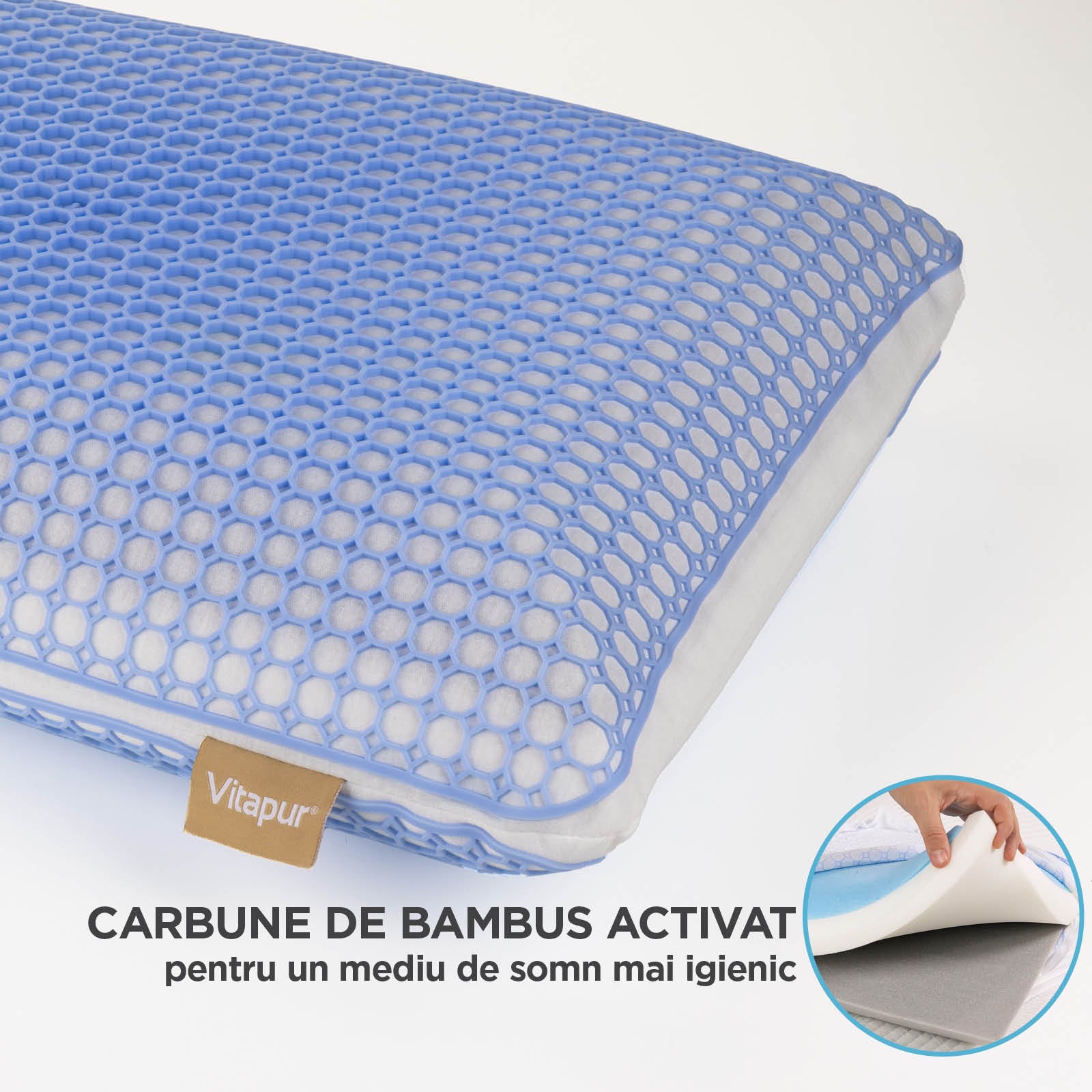 - Spuma cu memorie cu cărbune activ se adaptează poziției capului, elimină căldura excesivă și previne acumularea acarienilor.