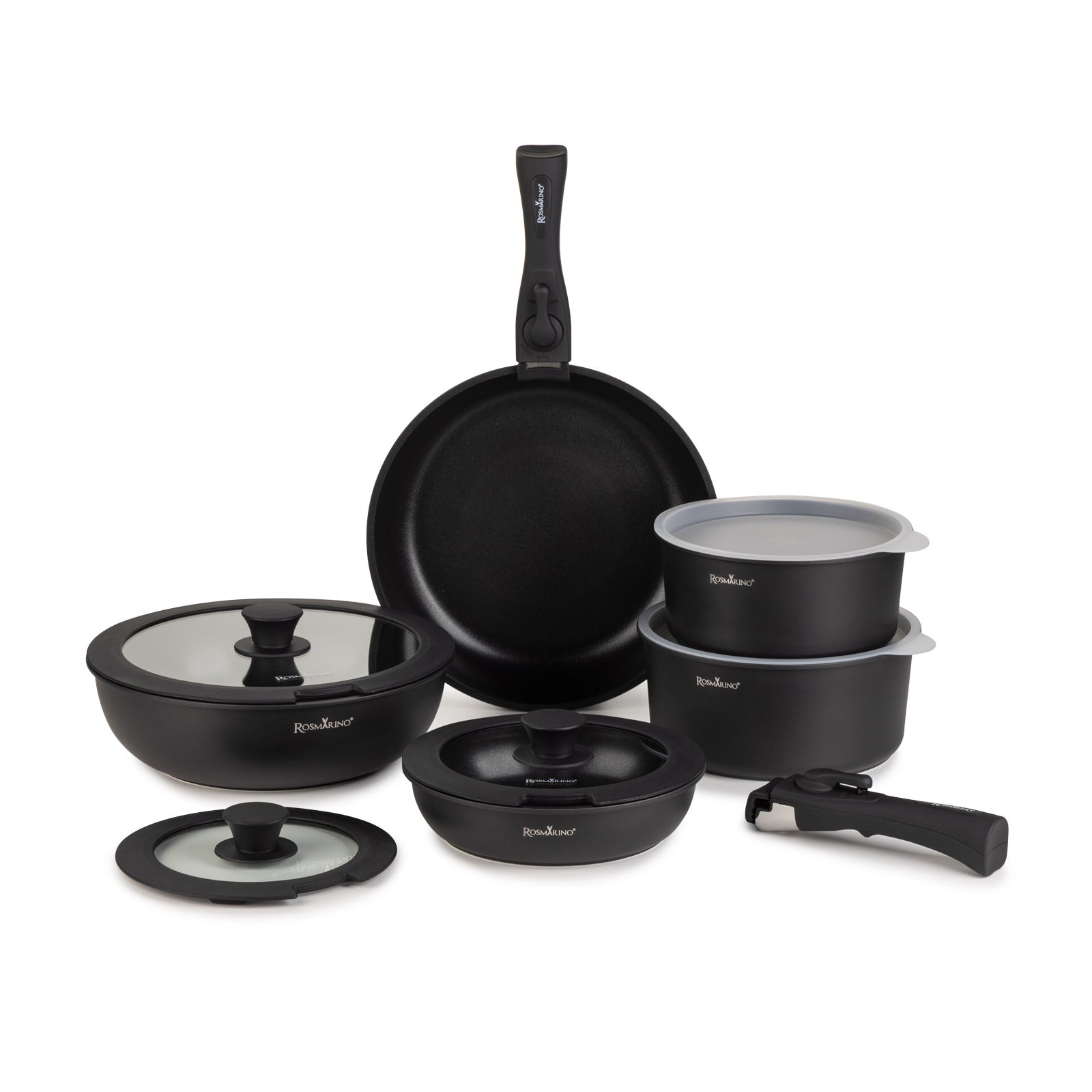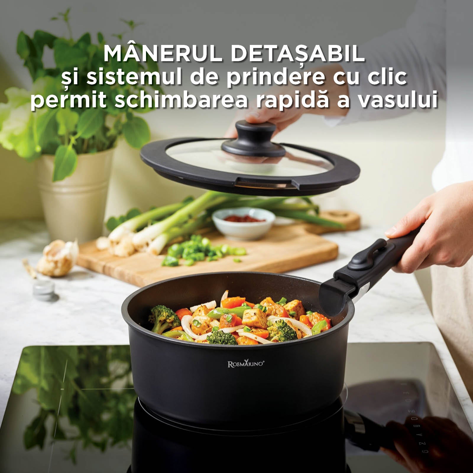 Setul conține tot ce îți trebuie pentru prepararea unei game variate de feluri de mâncare – de la tigăi, wok și cratițe până la două mânere detașabile pentru mai multă flexibilitate. Capacele din sticlă cu margine din silicon asigură gătitul fără stropire, iar capacele din silicon păstrează prospețimea alimentelor în frigider. De la omleta de dimineață până la sosul de duminică – vasul perfect pentru fiecare preparat.