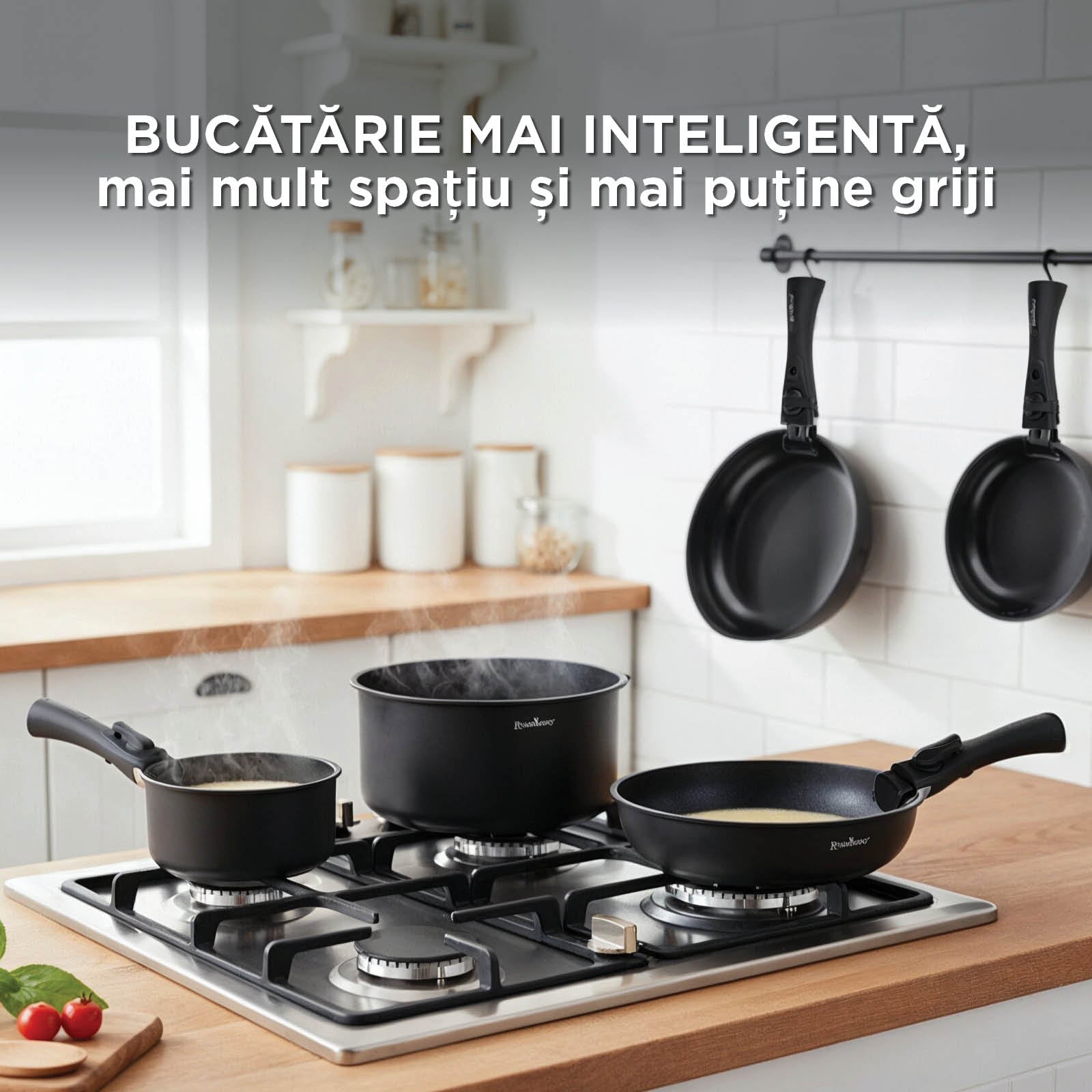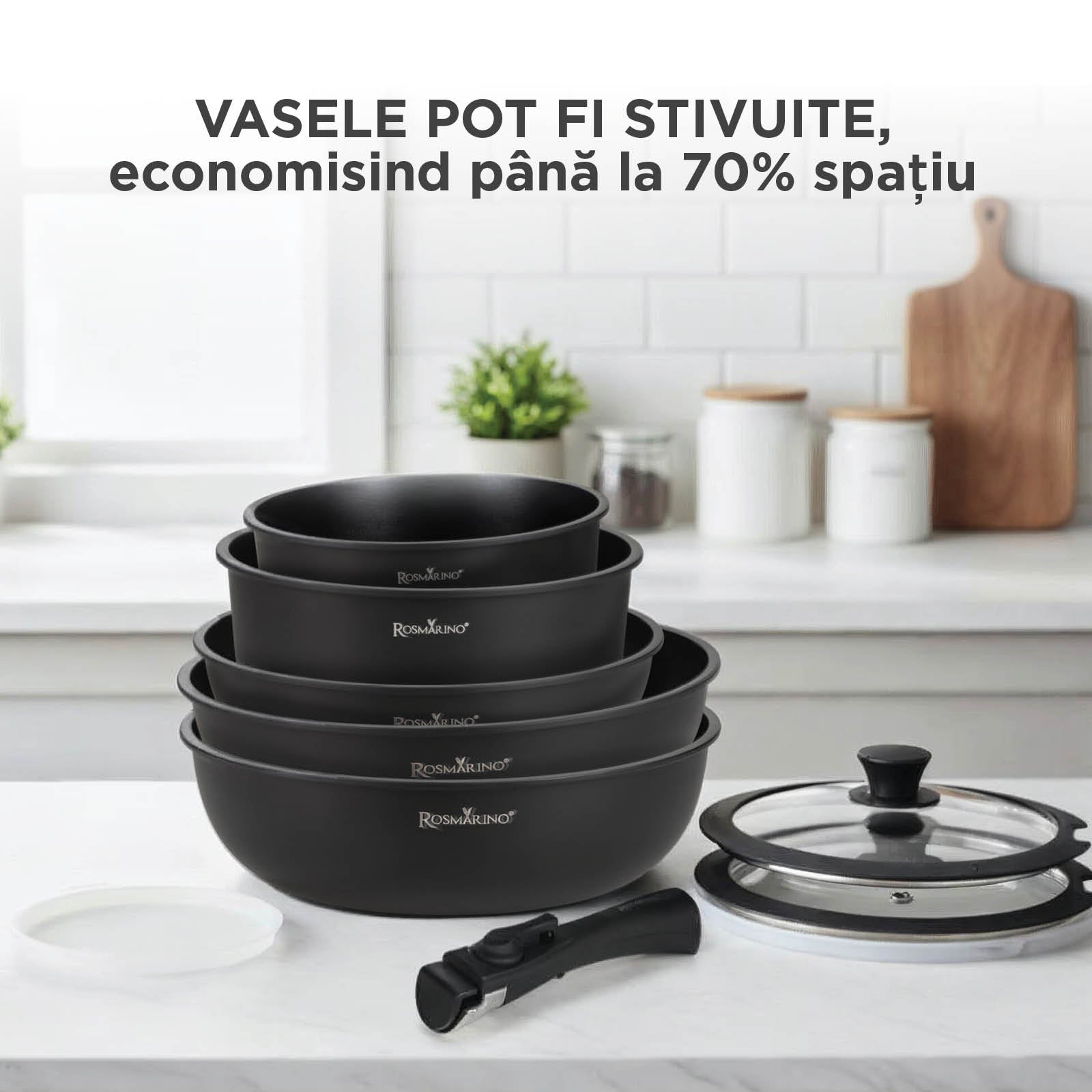 • Economisește până la 70% din spațiul din bucătărie – vasele se pot stivui ușor datorită mânerului detașabil.