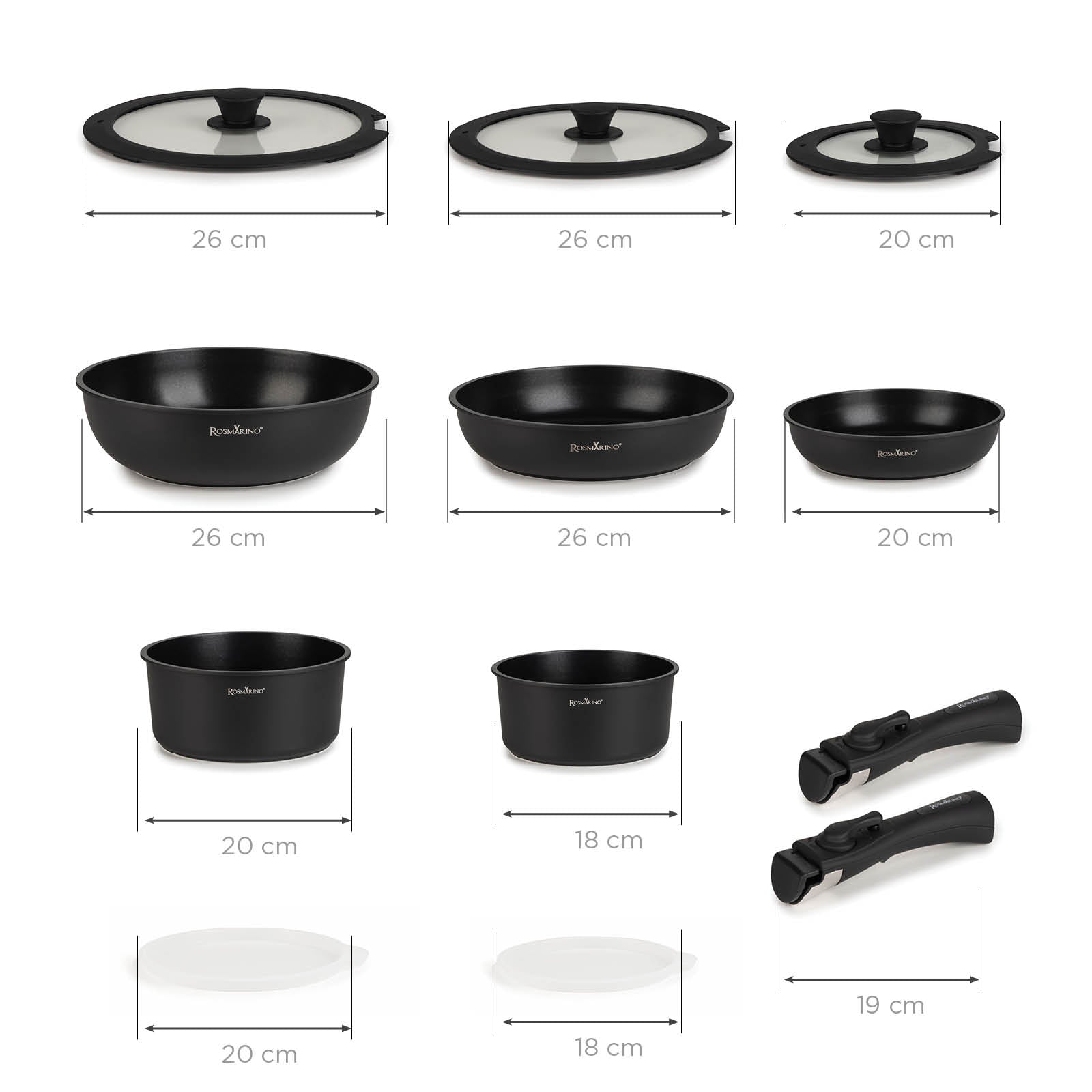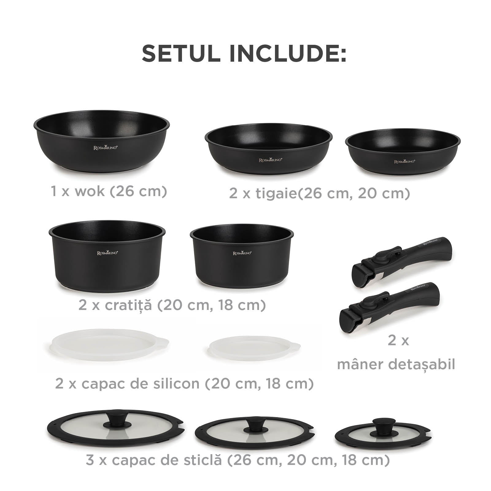 Setul include: 2 x tigaie (20 cm, 26 cm), 1 x wok (26 cm), 2 x cratiță (18 cm, 20 cm), 3 x capac din sticlă (18 cm, 20 cm, 26 cm), 2 x capac din silicon (18 cm, 20 cm), 2 x mâner detașabil.