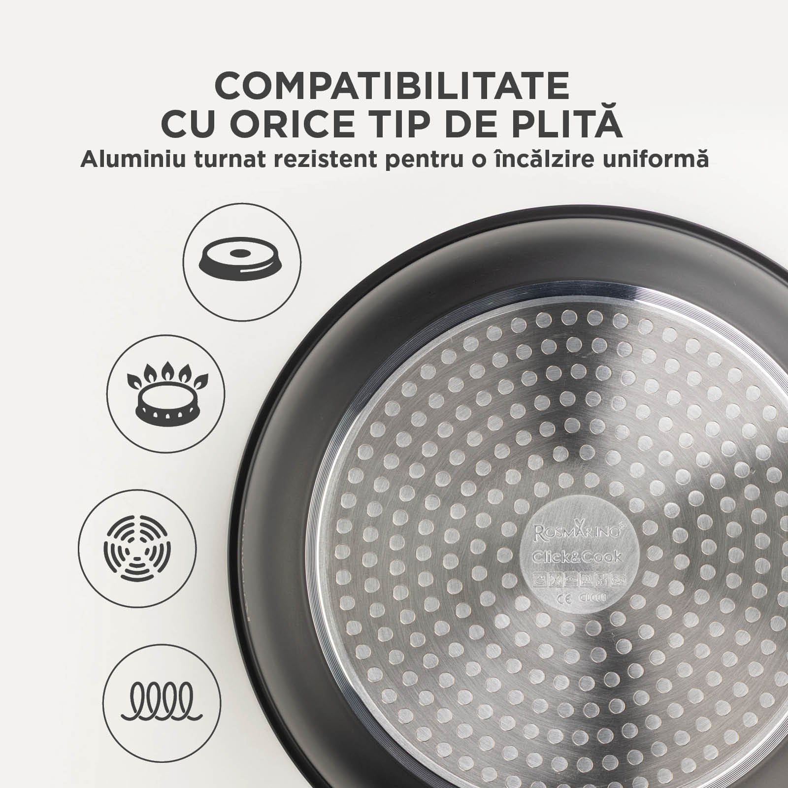 Aluminiul turnat cu bază groasă asigură o încălzire uniformă, o rezistență mai mare și o utilizare îndelungată. Fără alimente arse în mijlocul tigăii sau margini crude – mâncarea se gătește uniform, iar vasele nu își vor pierde forma sau funcționalitatea.