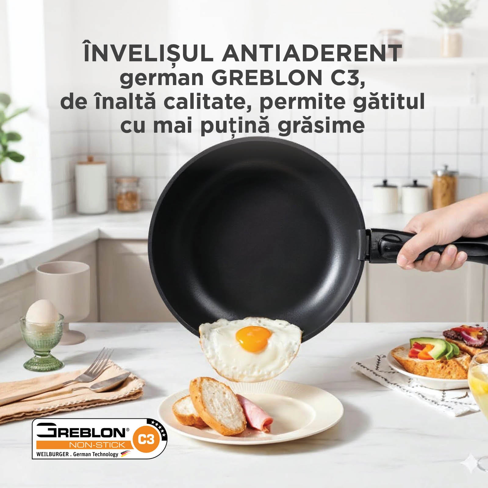 Stratul triplu GREBLON® C3 de calitate germană previne lipirea alimentelor, permite gătitul cu mai puțină grăsime și este complet lipsit de substanțe nocive (BPA, PFOA). Poți pregăti mese mai sănătoase, iar curățarea este rapidă și ușoară.