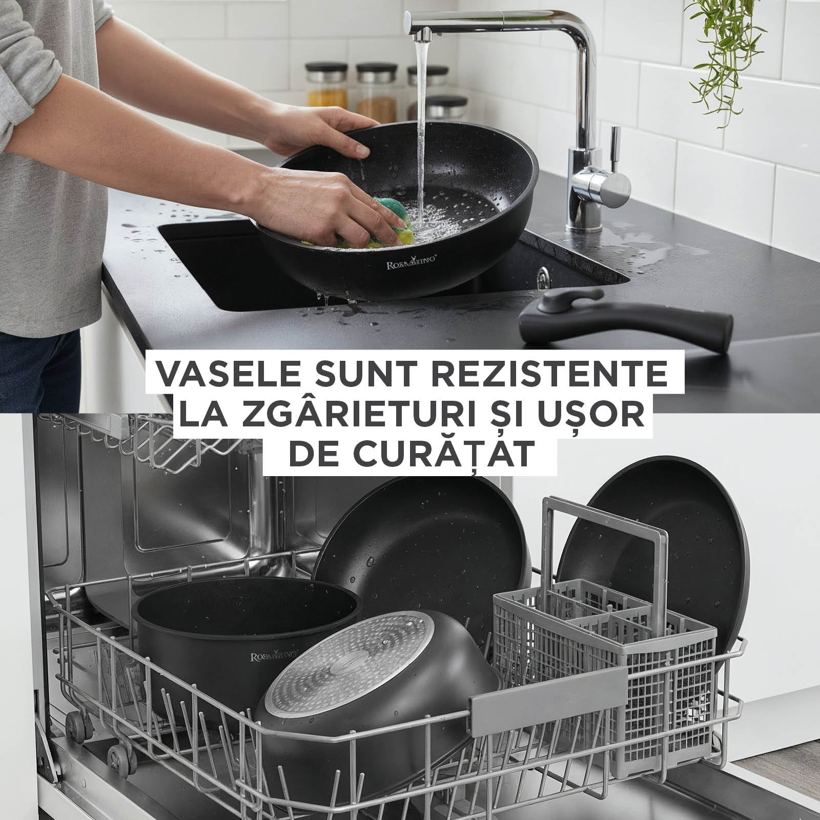 Curăță vasele cu un burete moale și detergent delicat. Ocazional, unge suprafața cu câteva picături de ulei. Nu supraîncălzi vasele goale. Lasă-le să se răcească complet înainte de spălare. Vasele pot fi introduse în mașina de spălat vase. Pentru o durată de viață mai lungă, evită ustensilele metalice și spală vasele manual. Îndepărtează întotdeauna mânerul înainte de utilizarea în cuptor.