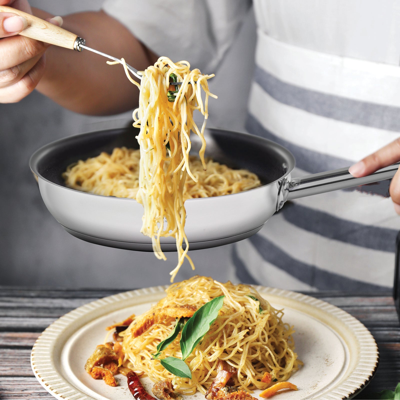 - Tigaie din oțel inoxidabil 18/10 de calitate germană cu fund de impact cu 3 straturi pentru durabilitate, încălzire rapidă și gătit uniform.