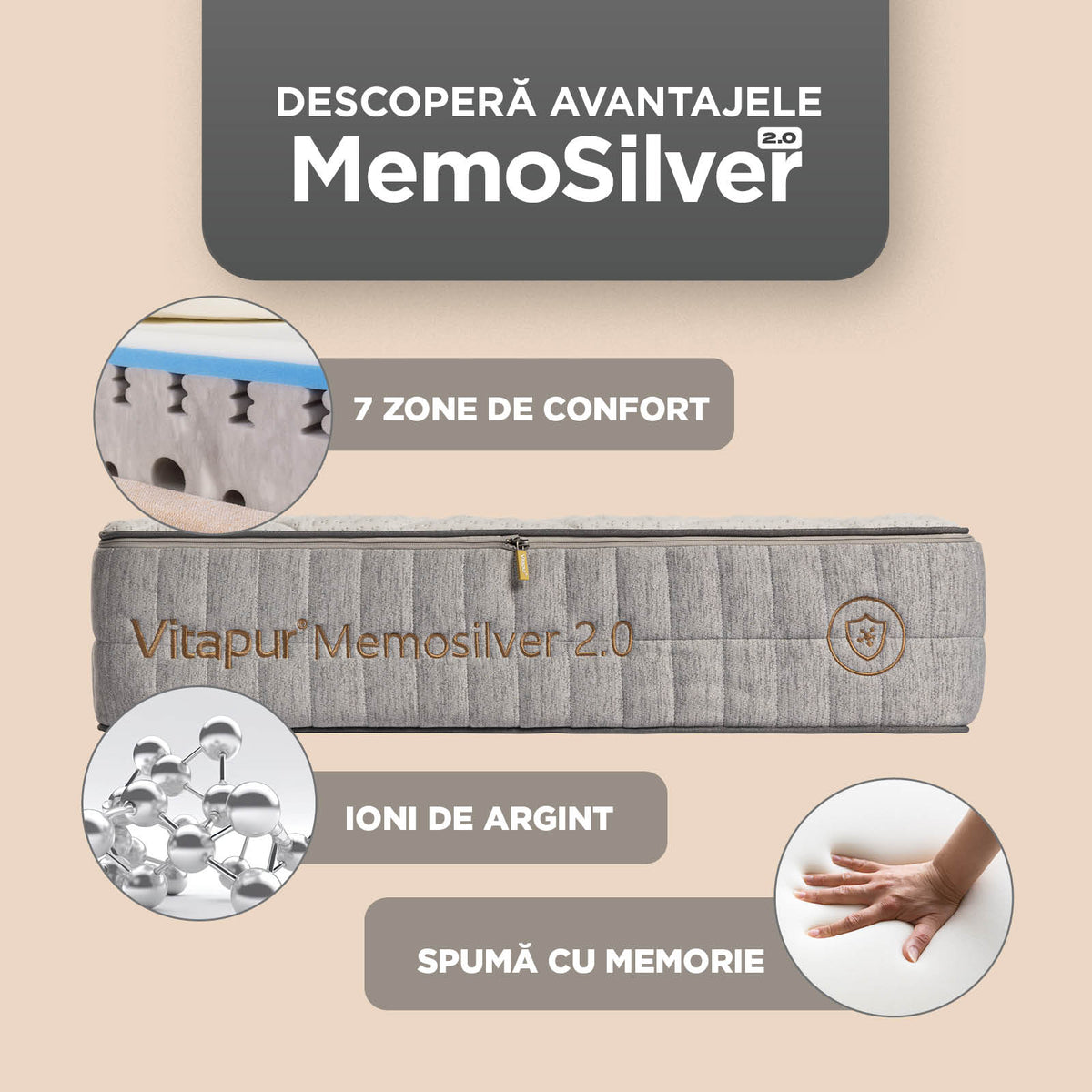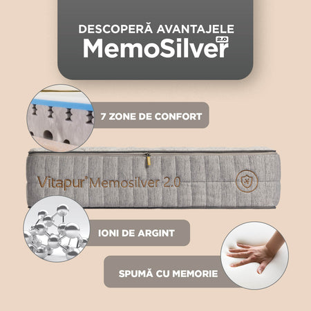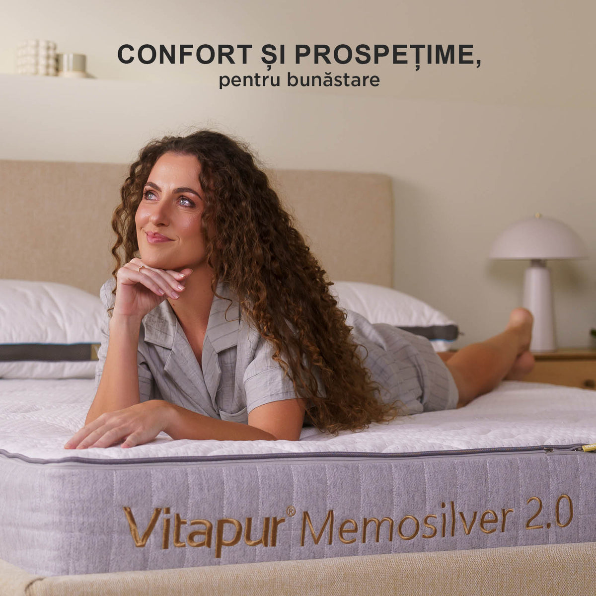 Descoperă somnul odihnitor cu noua saltea inovatoare din spumă cu memorie Vitapur MemoSilver 2.0. Această saltea este realizată din materiale atent selectate, fiind alegerea ideală dacă suferi de alergii sau ai pielea sensibilă. Pentru un mediu de somn mai curat și mai sănătos, husa conține ioni de argint care, datorită proprietăților antibacteriene, previn acumularea de bacterii, acarieni și alergeni. Miezul din spumă respirabilă asigură o circulație optimă a aerului și elimină excesul de căldură. Așadar, transpiri mai puțin, iar salteaua rămâne uscată, igienică și fără alergeni. Spuma de susținere cu șapte zone îți oferă confort în orice poziție de somn, sprijinind optim fiecare parte a corpului. Pentru o relaxare completă și o senzație de finețe la fiecare atingere, husa este îmbogățită cu spumă cu memorie care îți învăluie corpul și care se adaptează fiecărei mișcări.