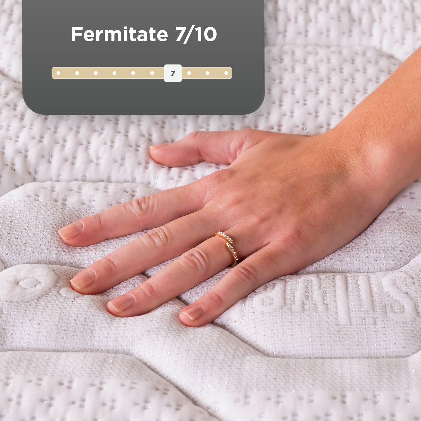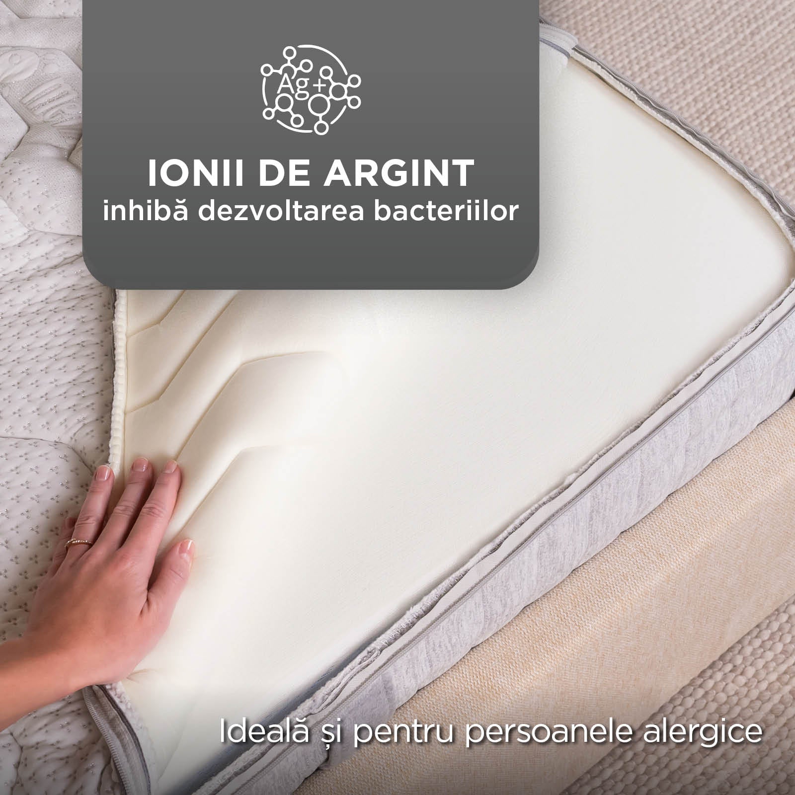 Husa este îmbogățită cu ioni de argint cu proprietăți antibacteriene. Aceștia previn dezvoltarea bacteriilor, acarienilor și mucegaiului, reducând încărcătura alergenică a saltelei și iritațiile pielii. O alegere excelentă pentru un somn sănătos, mai ales dacă ai alergii sau pielea sensibilă.