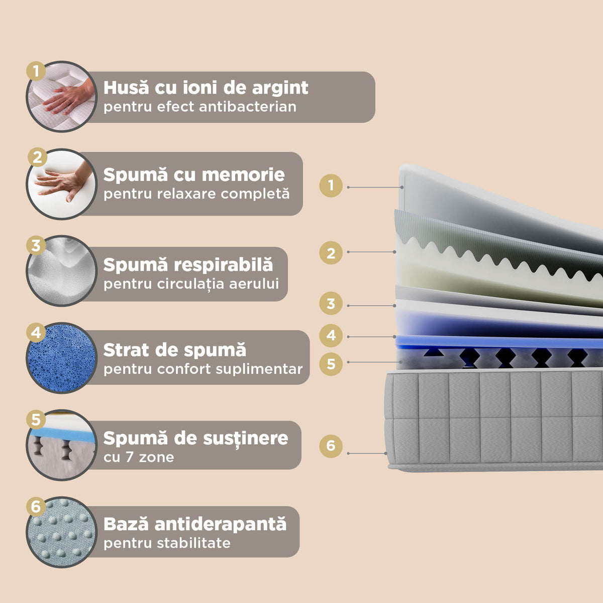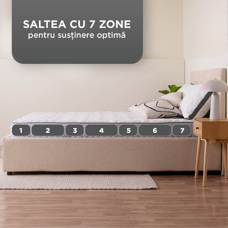 - Saltea din spumă înaltă și îmbunătățită, cu 7 zone de susținere, ce oferă confort și suport inovator în timpul somnului.