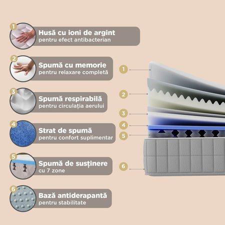 - Spumă specială, respirabilă, ce asigură o circulație optimă a aerului pentru un mediu de somn igienic pe tot parcursul nopții.