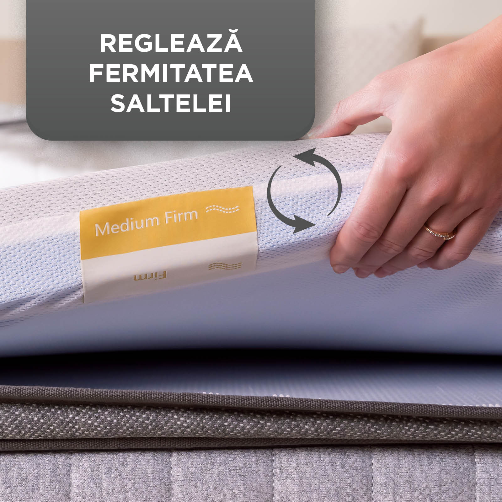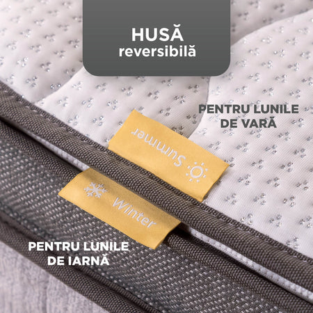 - Poți ajusta rapid fermitatea saltelei după preferințe, datorită topperului reversibil, cu o față moale și una fermă.