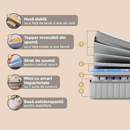 - Saltea inovatoare cu arcuri împachetate, care combină adaptabilitatea cu confortul personalizat.