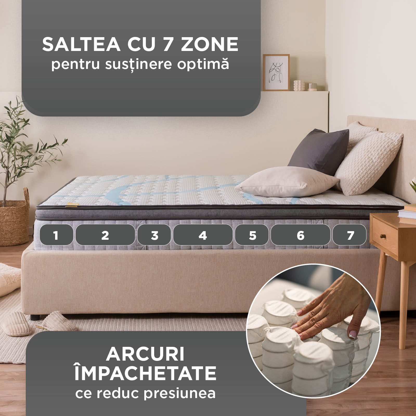 Arcuri de înaltă calitate și 7 zone pentru un somn confortabil în orice poziție.