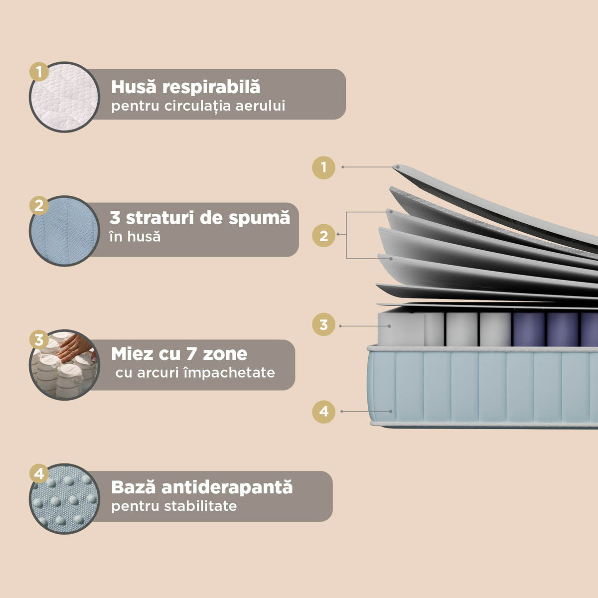 - Strat inferior antiderapant care oferă stabilitate și previne alunecarea saltelei în timpul somnului.