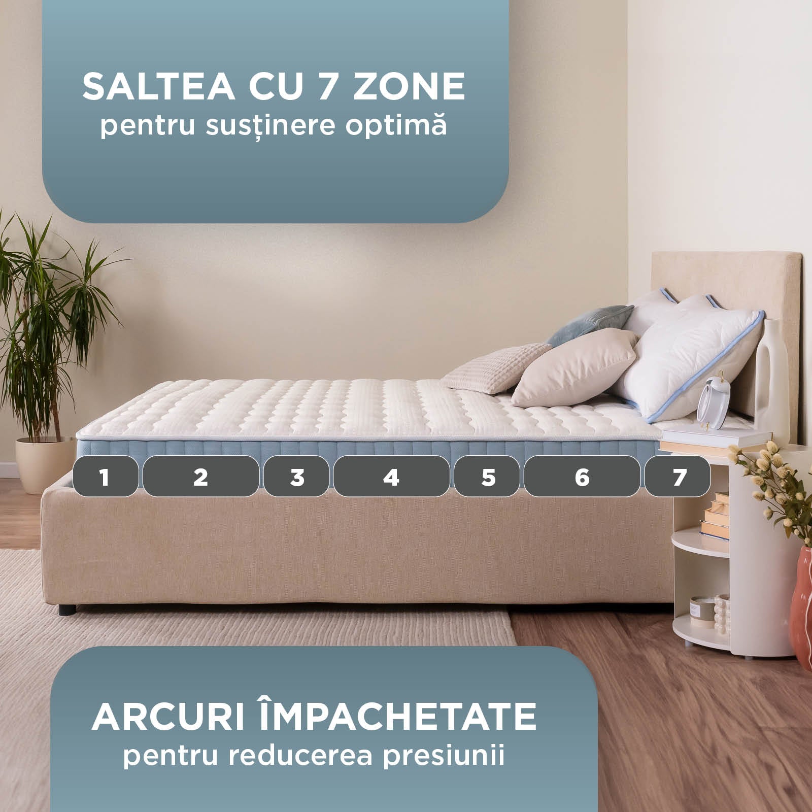 - Miez cu 7 zone pentru suport optim și alinierea corectă a coloanei vertebrale în timpul somnului.