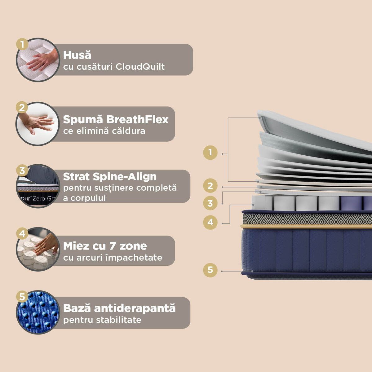 - Spuma respirabilă BreathFlex, asemănătoare latexului, asigură flexibilitatea optimă și circulația maximă a aerului, prevenind supraîncălzirea corpului în timpul somnului.