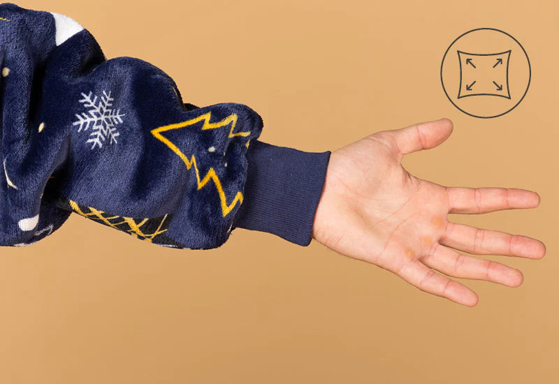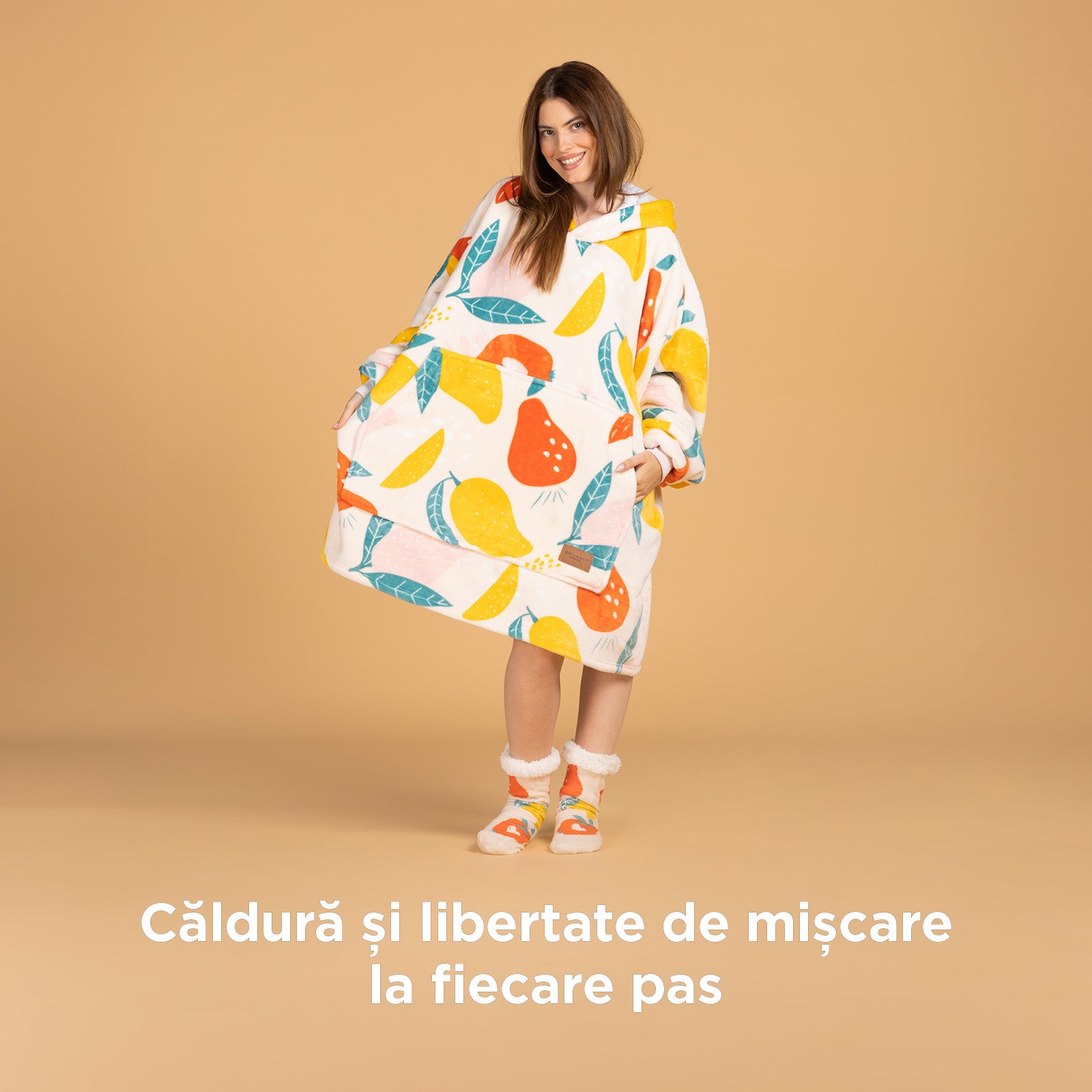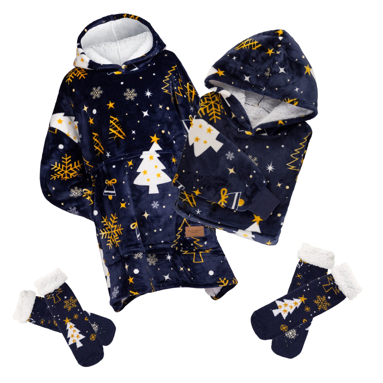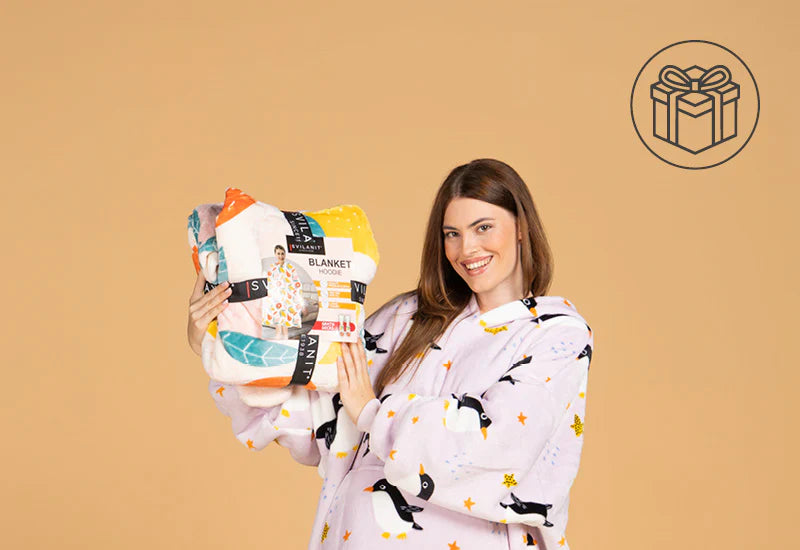 Dacă îți este frig la mâini, picioare sau urechi, întregul corp simte frigul. Pătura hanorac Svilanit rezolvă și această problemă. Gluga mare și călduroasă îți menține urechile calde, iar mâinile pot fi încălzite în buzunarul spațios, perfect și pentru ascunderea telecomenzii, pentru ca nimeni să nu schimbe canalul când urmărești serialul sau meciul tău preferat. Nu ignorăm nici picioarele – setul include șosete termo înalte și călduroase, cu protecție antiderapantă.