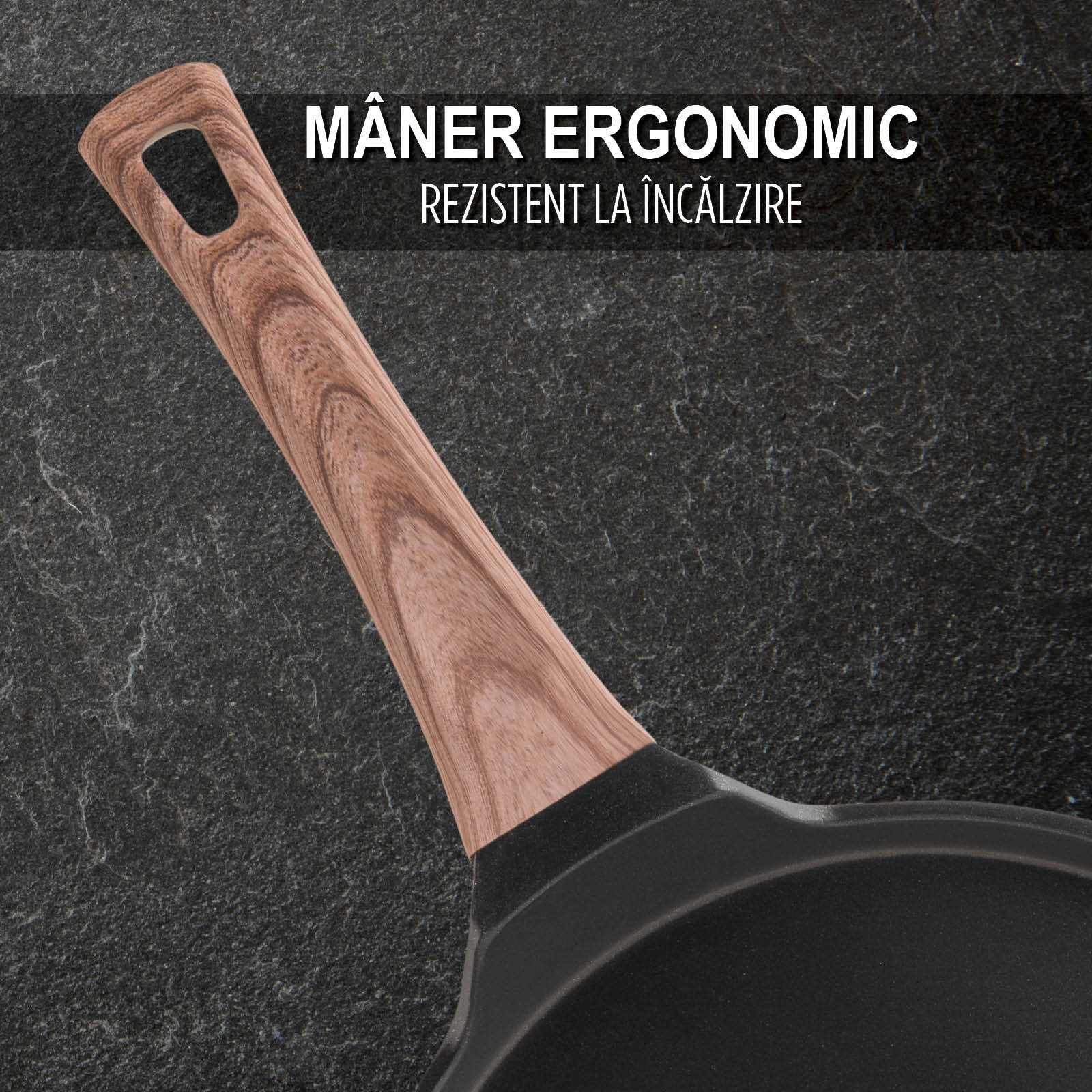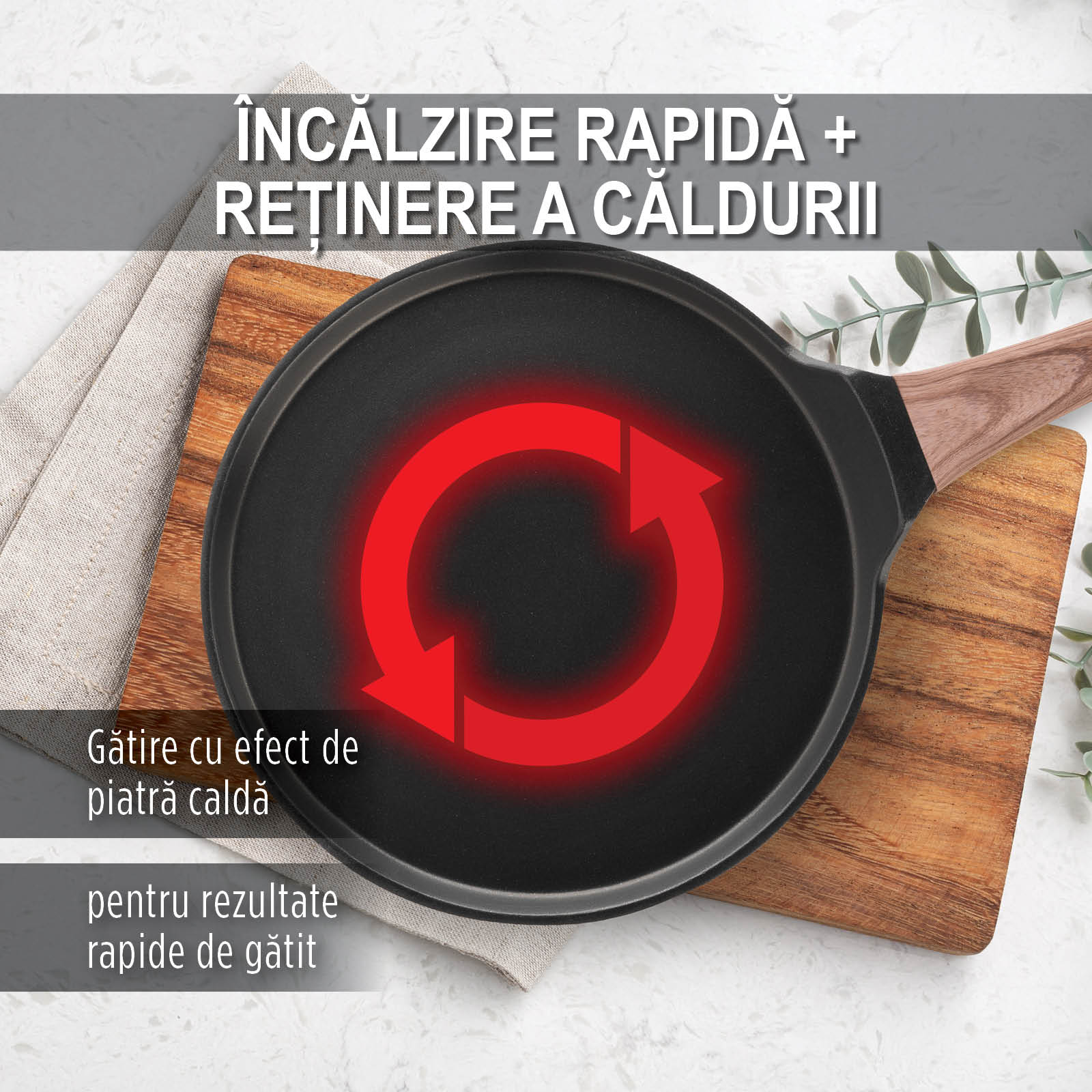 - Tigaie pentru clătite cu diametrul de 28 cm, realizată din aluminiu turnat de înaltă calitate.