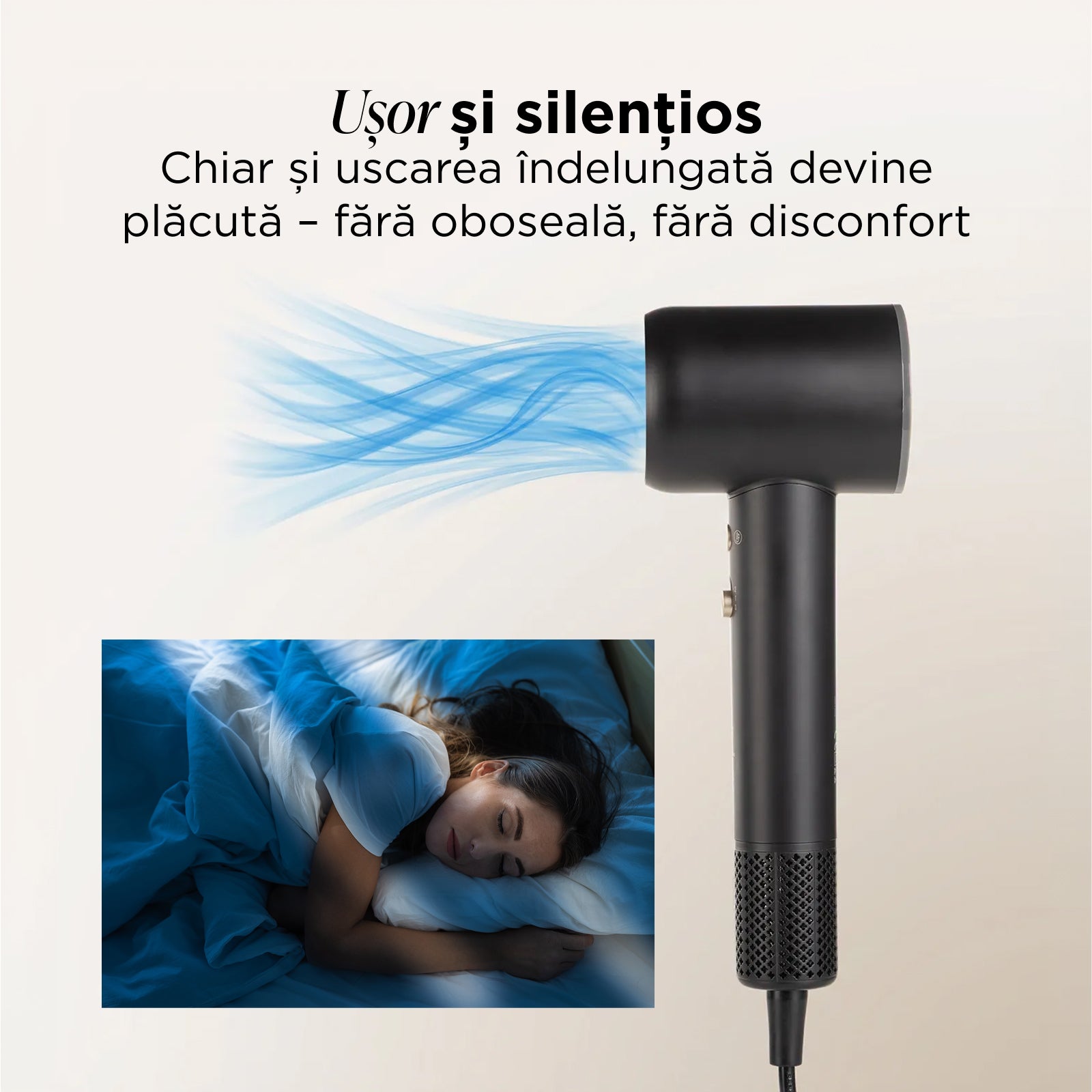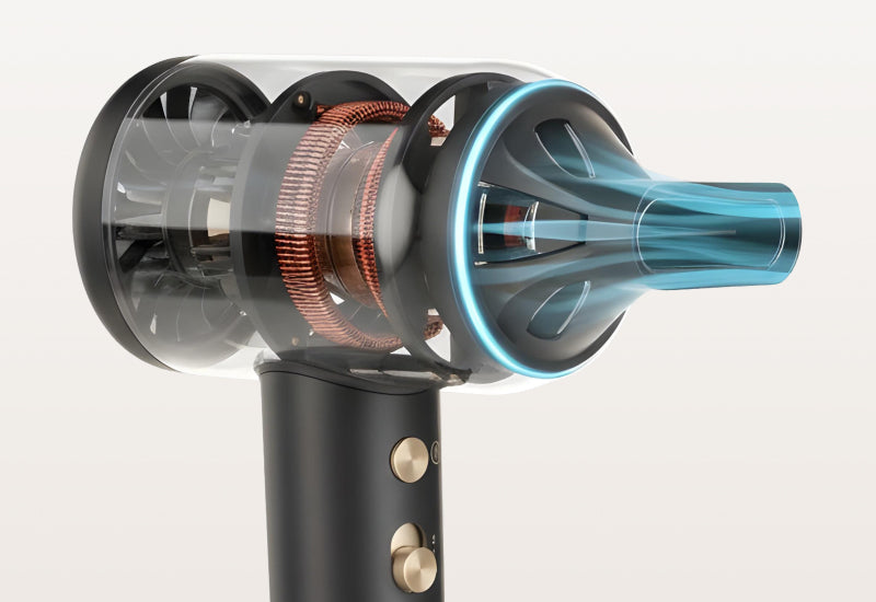 - Motor CA de înaltă performanță, cu durată lungă de viață: putere de uscare 1600–1900 W, viteză a aerului de până la 110.000 de rotații pe minut