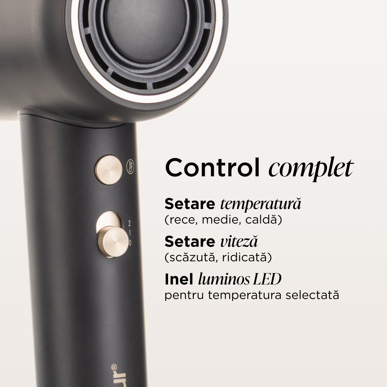 - 2 trepte de viteză și 3 trepte de temperatură (rece, medie, caldă), pentru control deplin